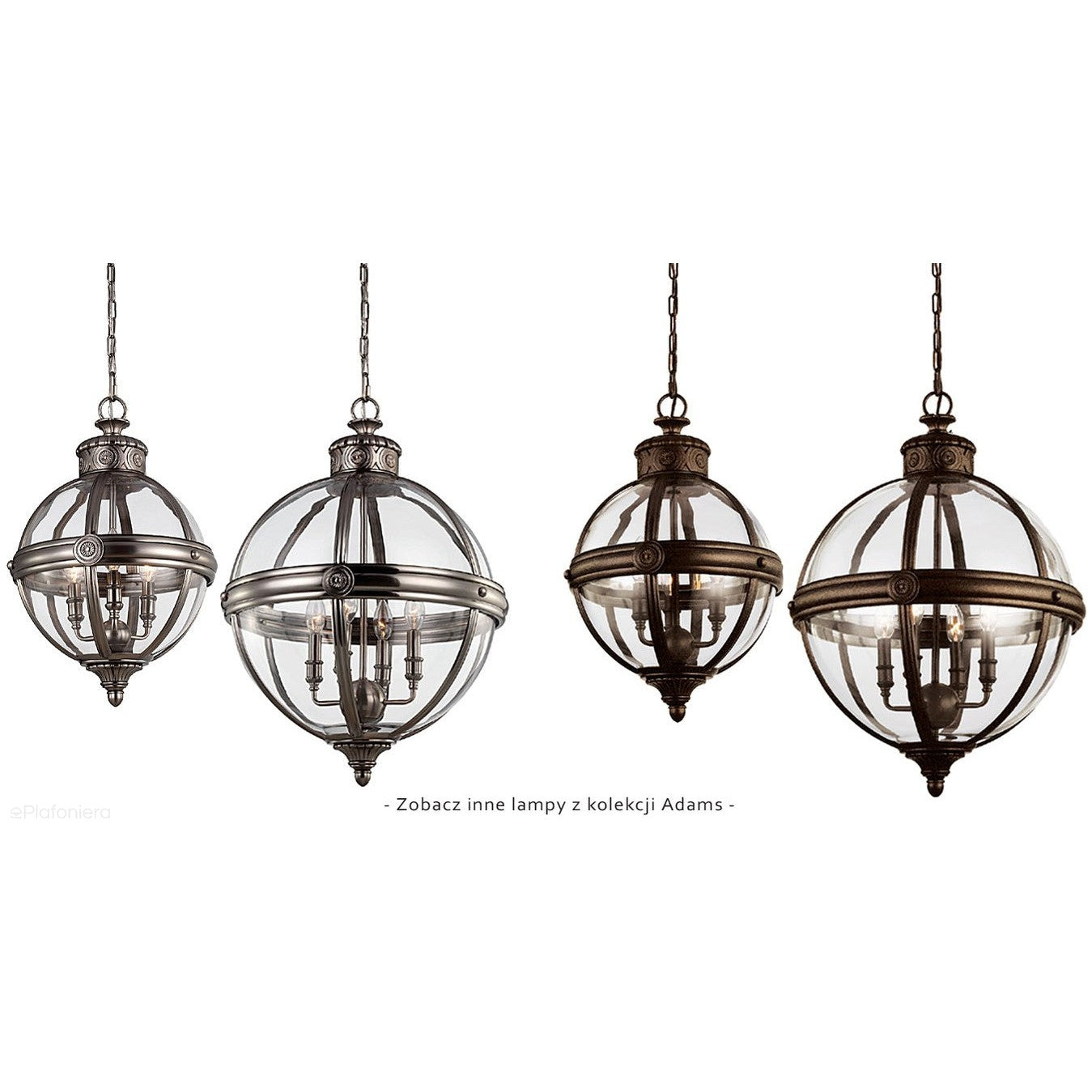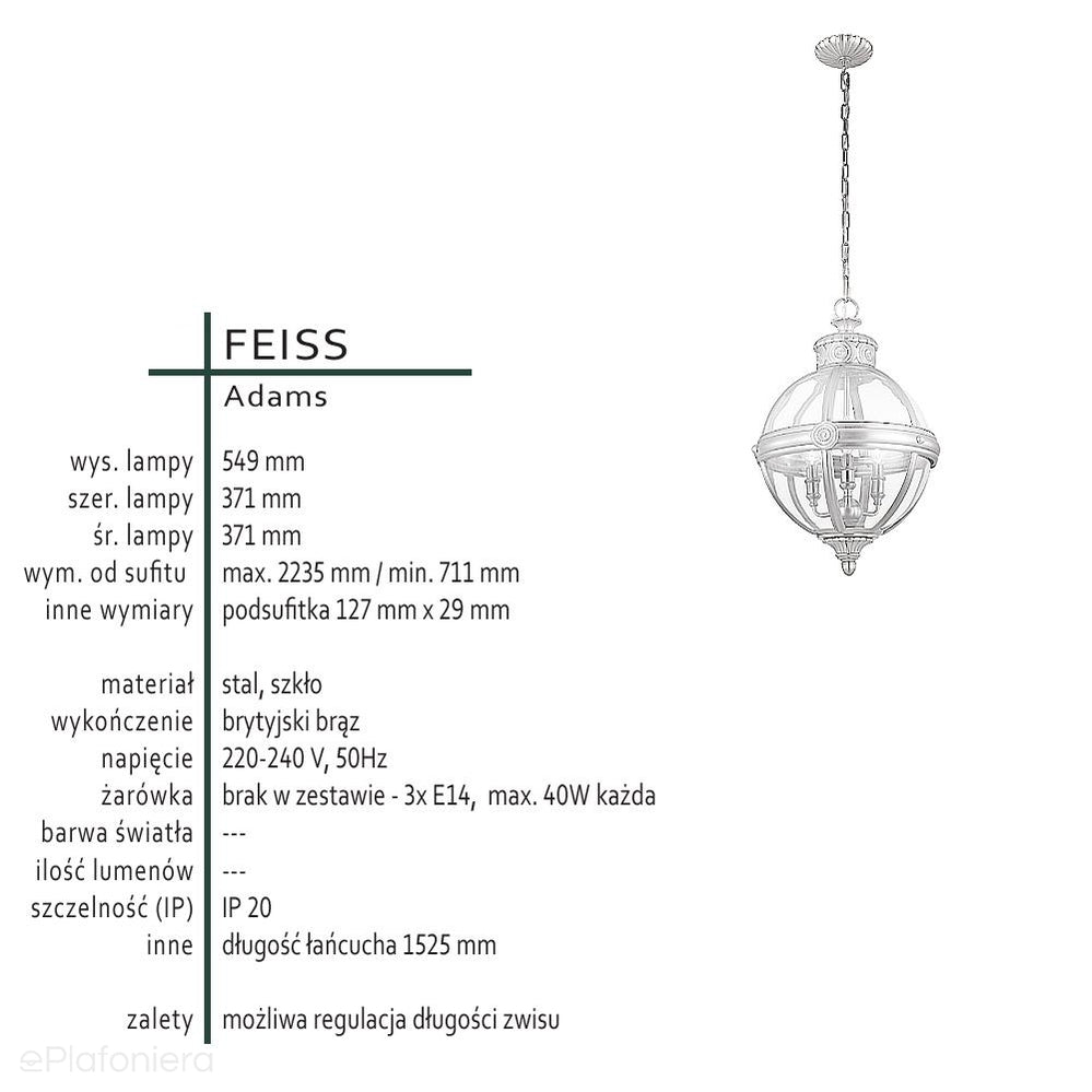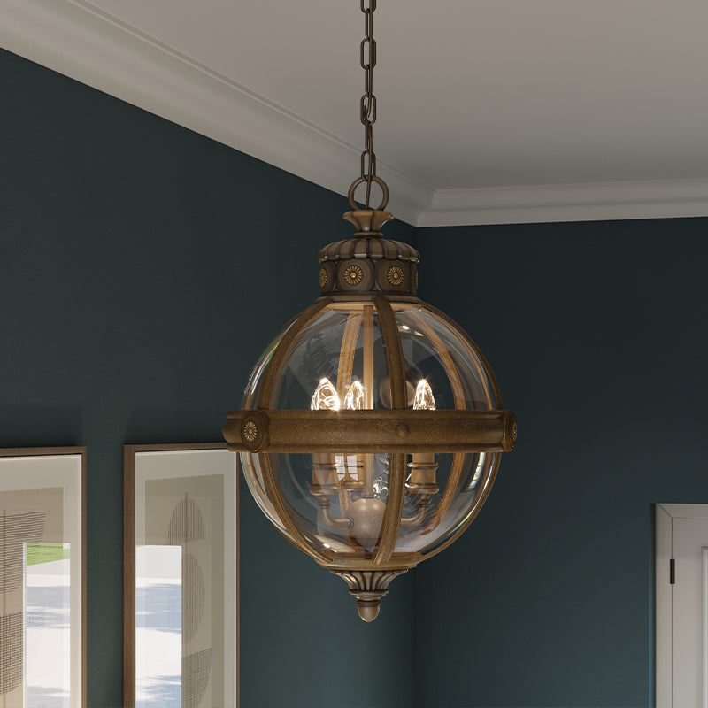 Nowoczesna lampa wisząca inspirowana antycznym stylem wiktoriańskim, szklana kula w stalowej oprawie (wykończenie - brytyjski brąz) z pięknymi kutymi detalami, w której wnętrzu znajdują się trzy żarówki – świeczki, zawieszona na łańcuchu.