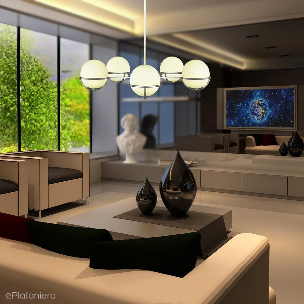 Kosmiczna inspiracja na pięć żarówek i artystyczny urok w połączeniu z modernistycznym designem sprawi, że ta lampa z pewnością stanie się centralnym punktem każdego pomieszczenia, w którym się znajdzie, nad stół, jako oświetlenie główne, do aranżacji w każdym stylu.