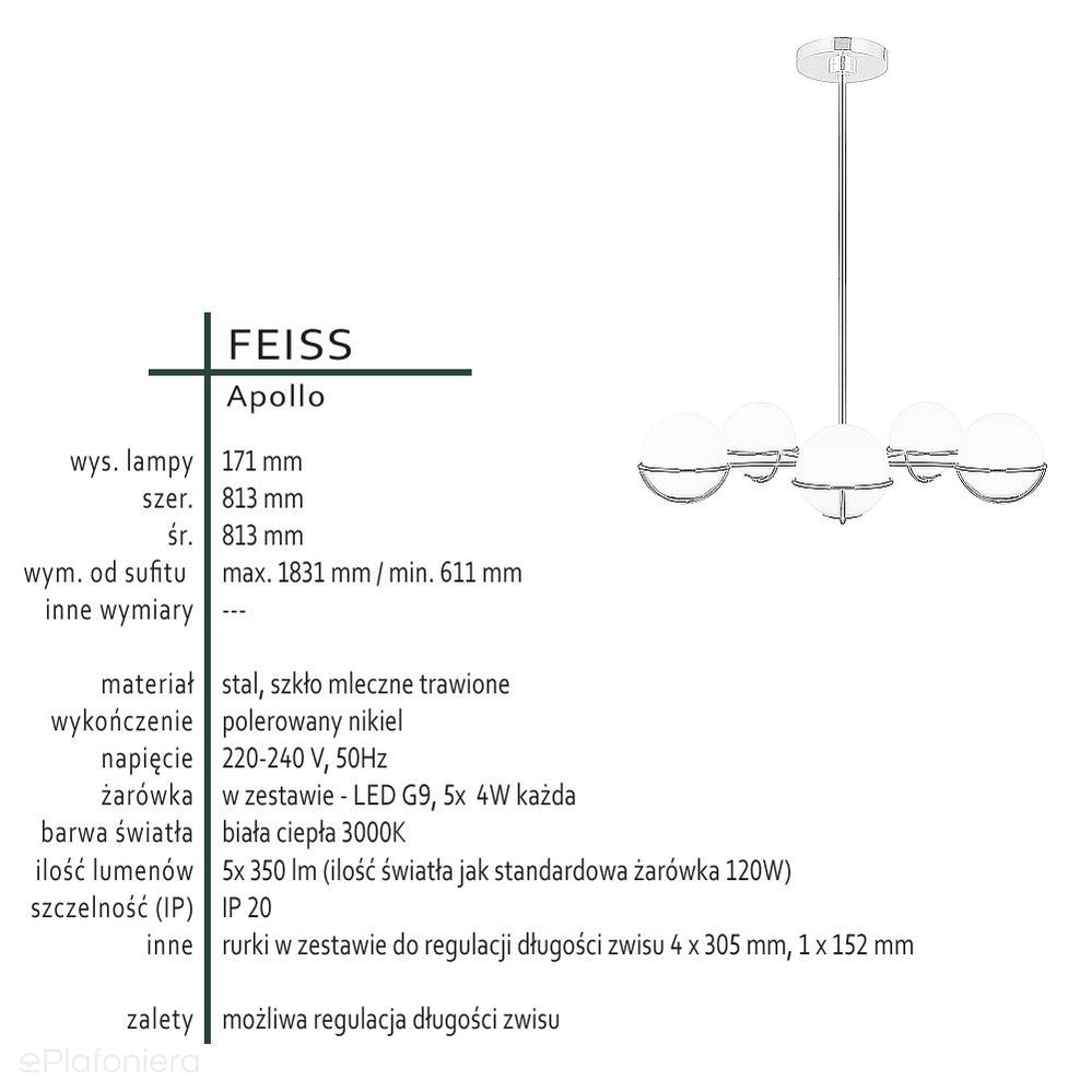 Żyrandol Apollo w stylu nowoczesnym (polerowany nikiel) do salonu / sypialni / kuchni - Feiss (G9 5x4W)