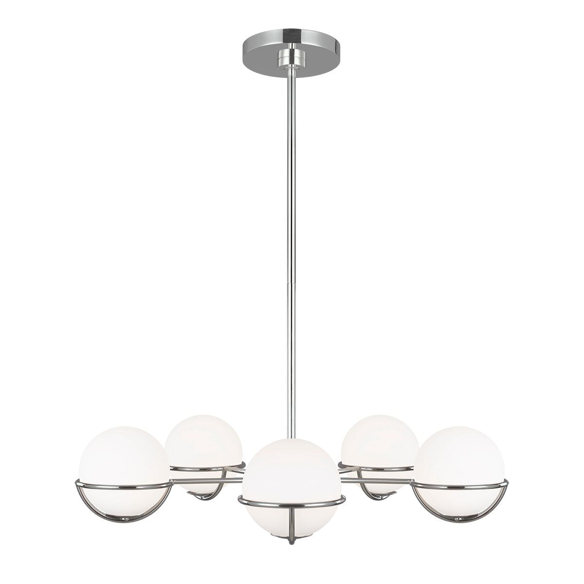 Nowoczesny, modernistyczny żyrandol, lampa wisząca na rurce (pięć rurek w komplecie do regulacji długości lampy) z ażurowymi miskami z niklu, w których leżą mleczne z trawionego szkła klosze kule.