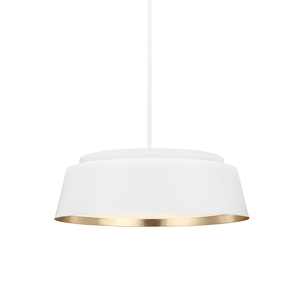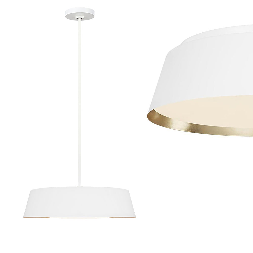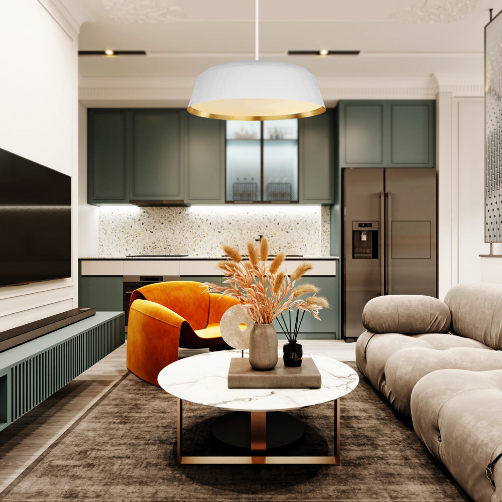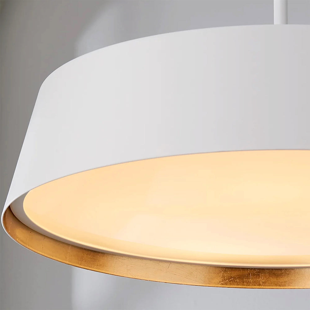 Nowoczesna lampa o współczesnym designie wisząca na rurce z metalowym abażurem, na pięć żarówek, w kolorze matowej bieli wyróżnia się subtelną elegancją.