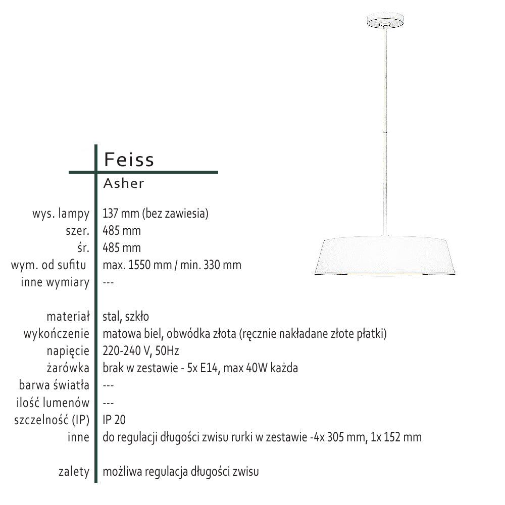 Modna lampa wisząca do kuchni, jadalni, salonu, biała metalowa 5xE14, Feiss (Asher)