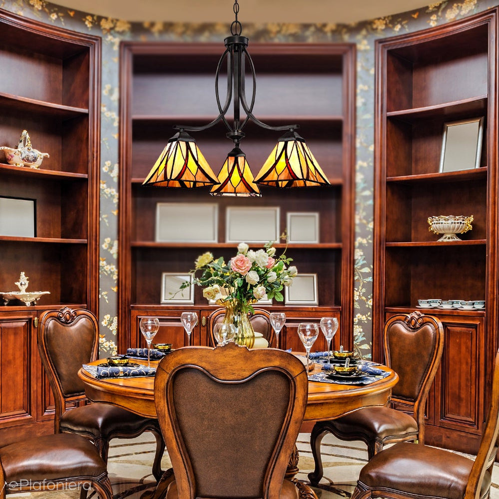 Żyrandol wiszący na łańcuchu w stylu Tiffany, na trzy żarówki, wywodzi się z lamp witrażowych stylu art deco, wykonanie ręczne trzy klosze ułożone z kawałków szkła w odcieniach bursztynu.