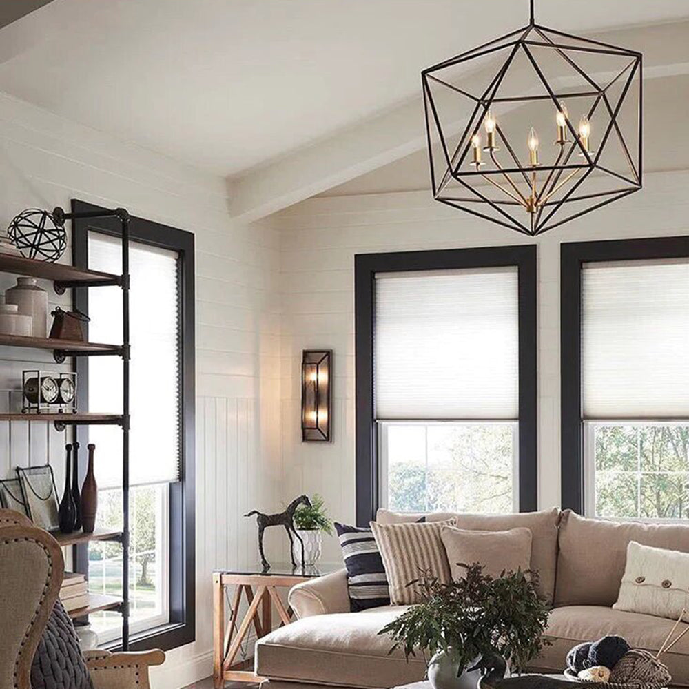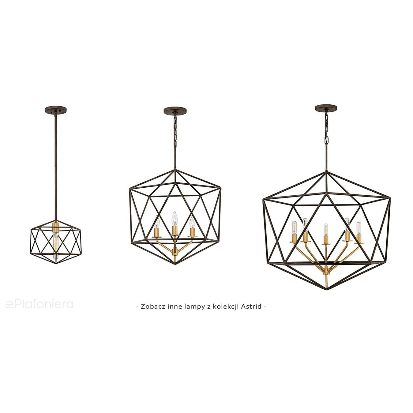 Nowoczesna lampa wisząca na łańcuchu, z pięcioma żarówkami na mosiężnej podstawie, wewnątrz ażurowej konstrukcji ułożonej z wielu trójkątów wykonanych ze stalowych prętów.