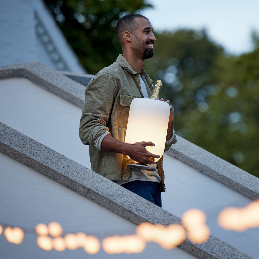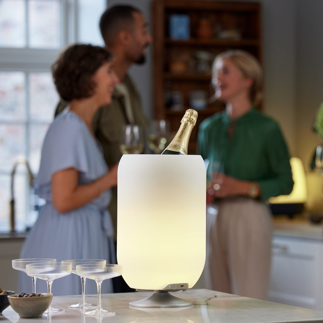 Kooduu Atmos to luksusowa lampa z opcją przyciemniania, wygodny schwoek na napoje oraz wysokiej jakości głośnik Bluetooth, zamknięte w jednym eleganckim, cylindrycznym projekcie. Jego kompaktowy i poręczny kształt pomieści 2 standardowe butelki wina, a wbudowany moduł Kooduu Bright Sound Technology™ zapewnia ciepłe, regulowane oświetlenie oraz czysty dźwięk.