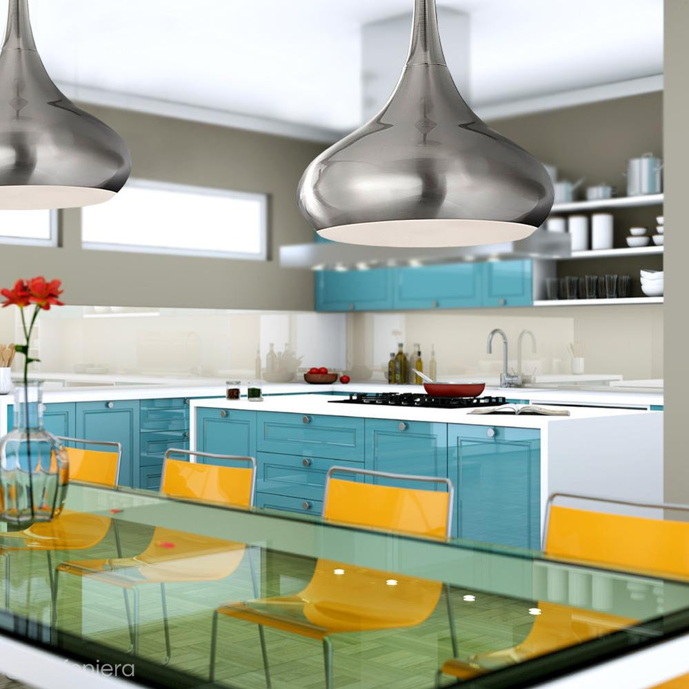 Warto zawiesić kilka takich lamp w szeregu lub grupie na różnych wysokościach oraz pomieszać wielkości lamp z tej samej serii.