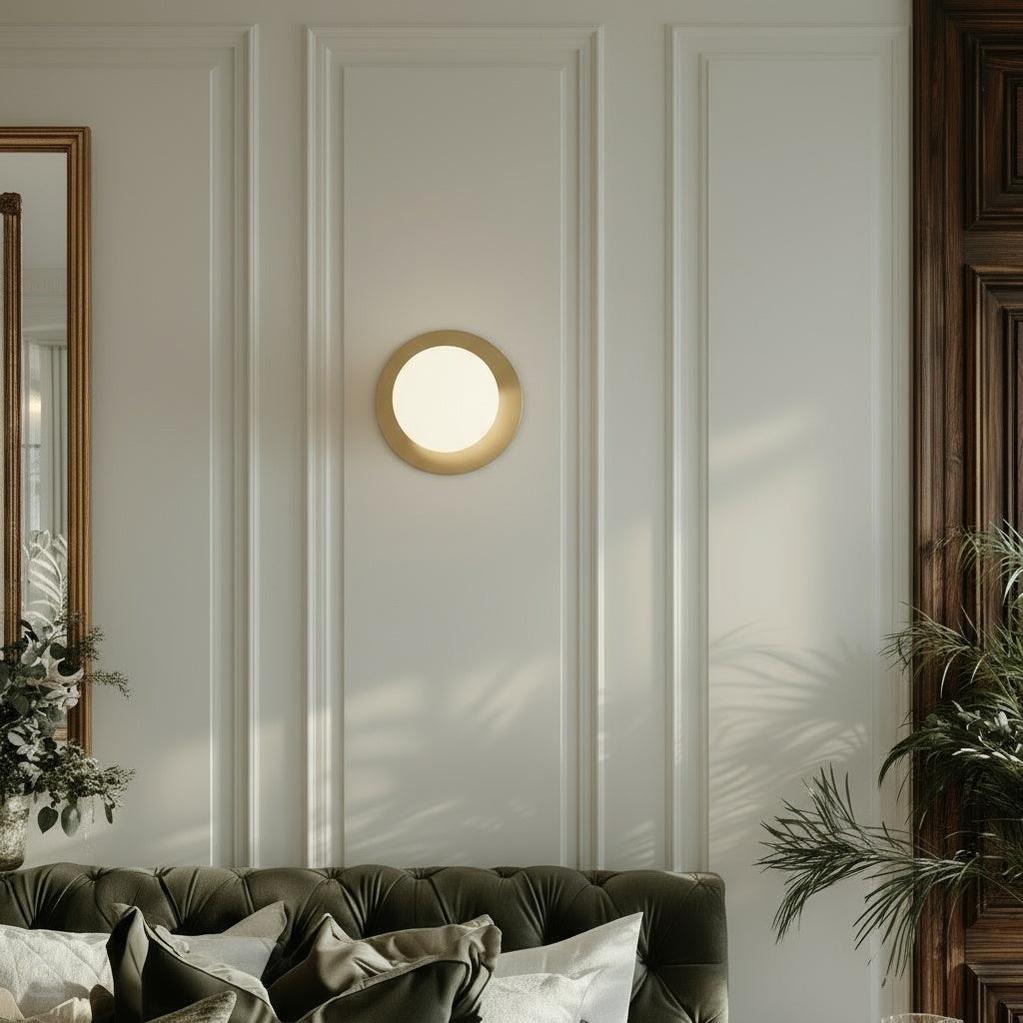 Nowoczesny kinkiet, na dysku z surowego mosiądzu osadzony jest szklany klosz – kula, w białym matowym kolorze.
