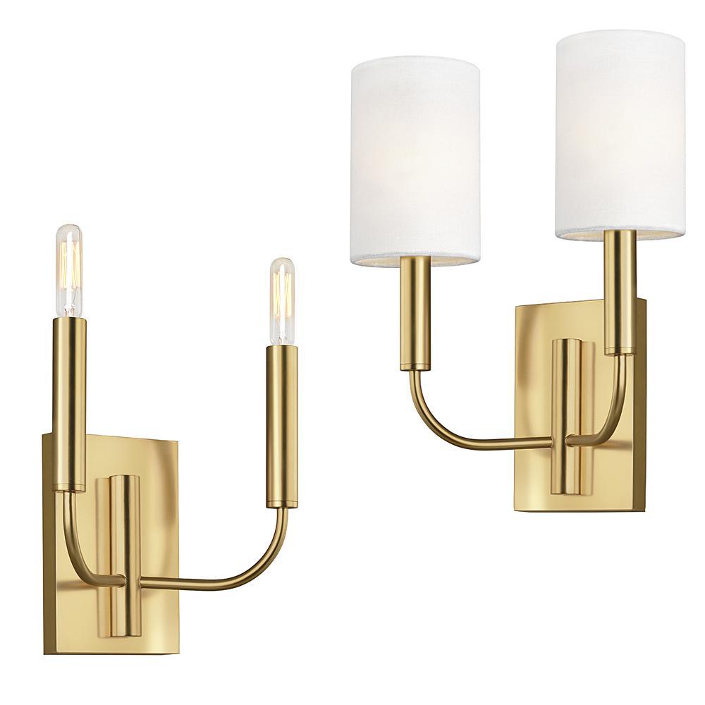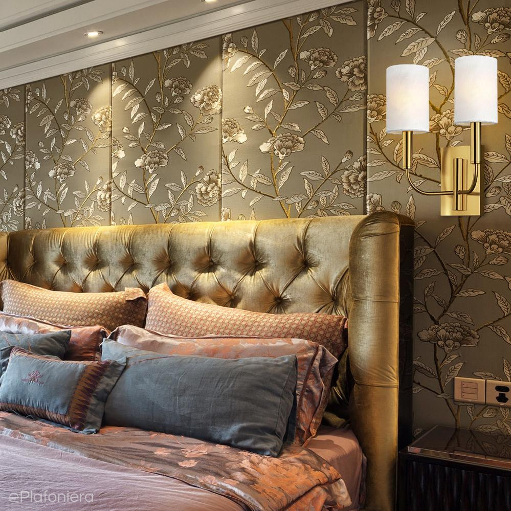 Nowoczesny kinkiet o klasycznej sylwetce, na wygiętych ramionach pokrytych warstwą oksydowanego mosiądzu mały, biały, walcowaty lniany abażur - klosik.