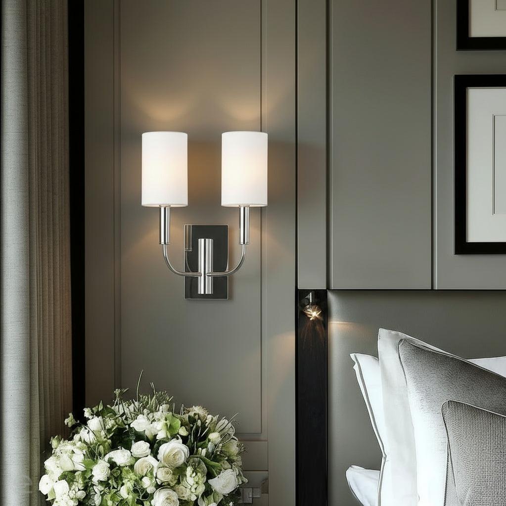 Nowoczesny kinkiet o klasycznej sylwetce, na wygiętych ramionach pokrytych warstwą polerowanego niklu mały, biały, walcowaty lniany abażur - klosik.