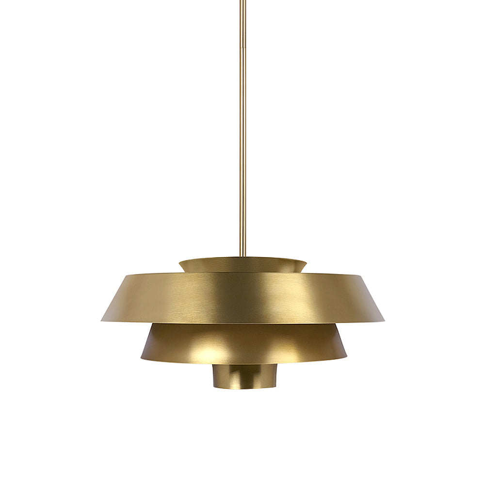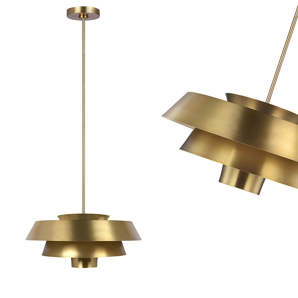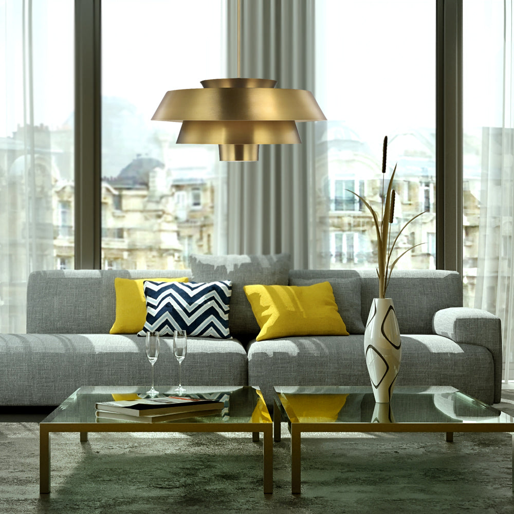 Nowoczesna lampa wisząca na rurce o regulowanej długości, z trójstopniowym okrągłym bardzo dekoracyjnym abażurem w kolorze oksydowanego mosiądzu od wewnątrz pomalowanym na biało, dzięki czemu światło wpadające w każdą kolejną metalową warstwę odbija się od jej powierzchni i rozprasza.