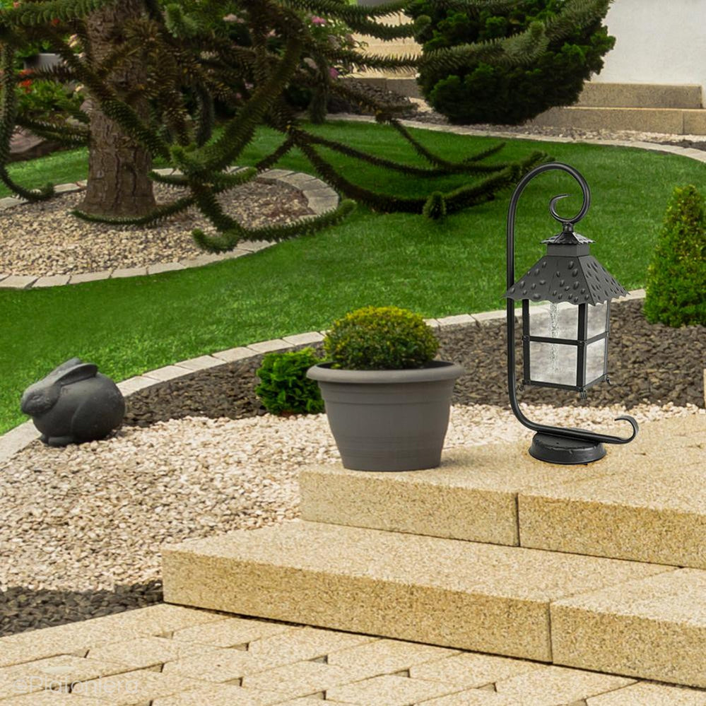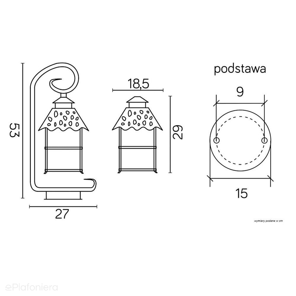 Klasyczna lampa stojąca o wymiarach – wysokość 53 cm, szerokość 18,5 cm, głębokość 27 cm, zewnętrzna o IP 43, latarnia z aluminium w kolorze czarnym z szybkami z ozdobnego szkła lodowego.