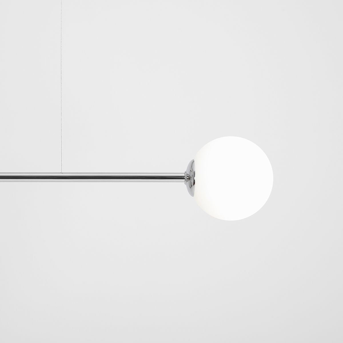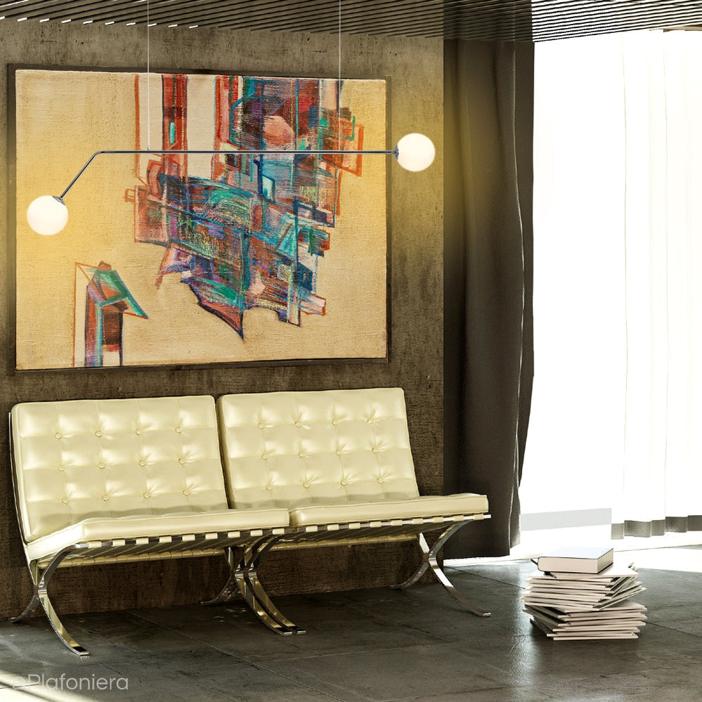 Nowoczesna, nowatorska w swojej formie lampa pozioma, wisząca na linkach, chromowana z białymi, szklanymi kloszami – kulami do wnętrz industrialnych, glamour, skandynawskich.