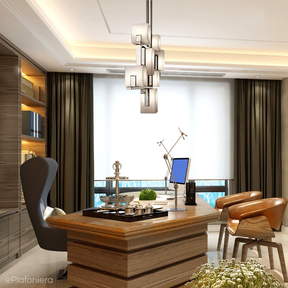 Nowoczesny żyrandol LED poziomy, wiszący na rurkach (w zestawie osiem rurek do regulacji długości), układ pionowych i poziomych linii z polerowanej stali, w które strategicznie włożono siedem szklanych, mlecznych kloszy – kubików, ukrywających źródła światła.
