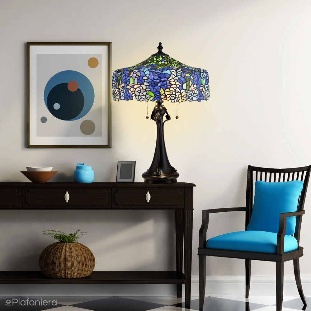 Lampa stojąca stołowa, biurkowa w stylu Tiffany, na trzy żarówki, wywodzi się z lamp witrażowych stylu art deco, wykonanie ręczne, klosz ułożony z kawałków szkła z motywem hortensji w bogatych odcieniach błękitu oraz z delikatną nutą lawendy i zieleni.