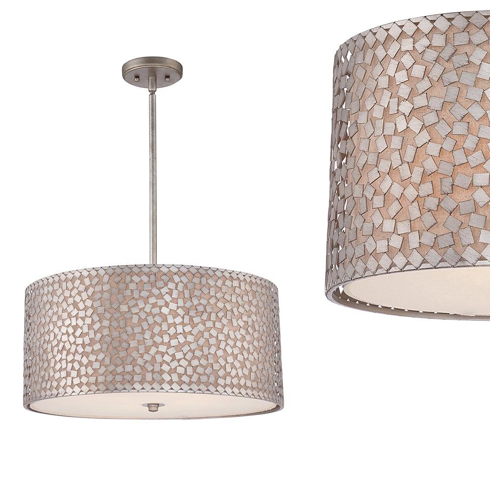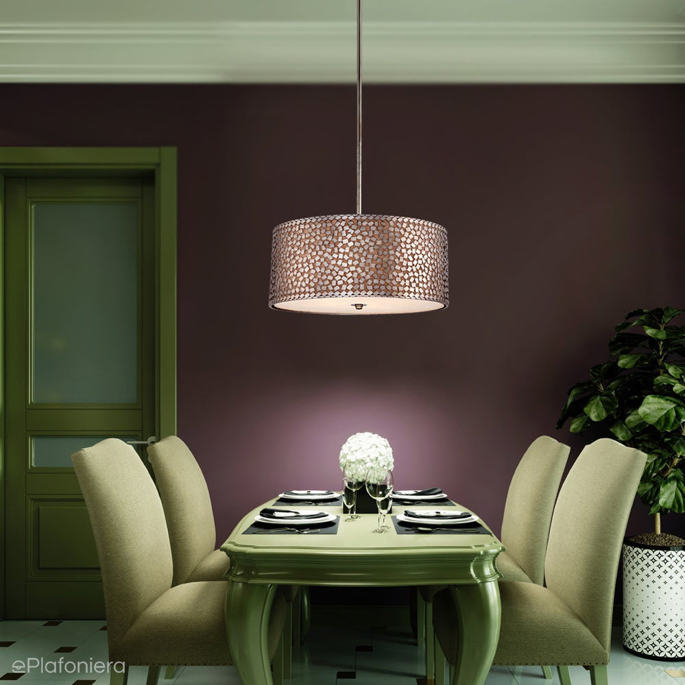 Nowoczesna lampa wisząca na rurce (cztery rurki w zestawie) o klasycznym, bardzo dekoracyjnym wyglądzie, mała, na cztery żarówki. Lampa w formie walca, który z zewnątrz jest ażurowy, wypełniony metalowymi elementami przypominającymi konfetti, a wewnątrz płócienny w kolorze przełamanej bieli wraz ze szklanym dyfuzorem od dołu.
