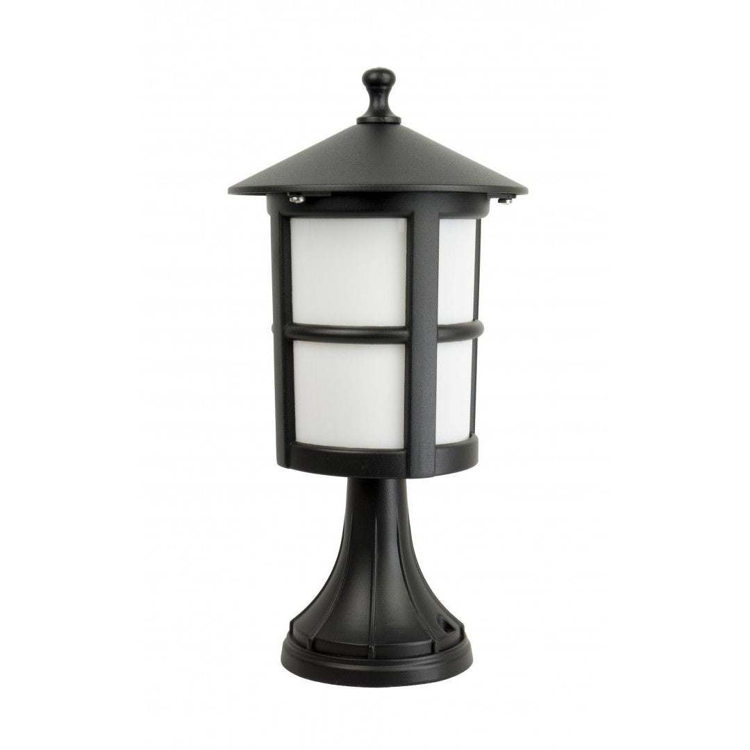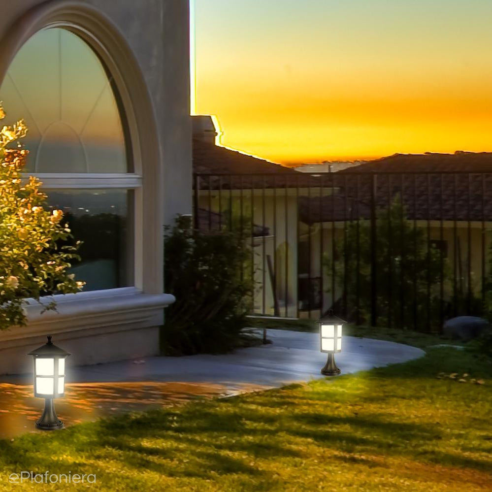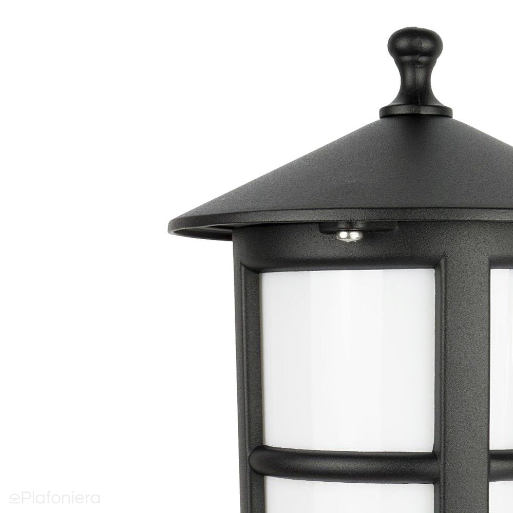 Klasyczna lampa stojąca zewnętrzna o IP 23, w kolorze czarnym, owalna, aluminiowa latarnia z mlecznym kloszem o wymiarach – wysokość 41 cm, średnica 20 cm, wykonana z materiałów wytrzymałych na warunki atmosferyczne.