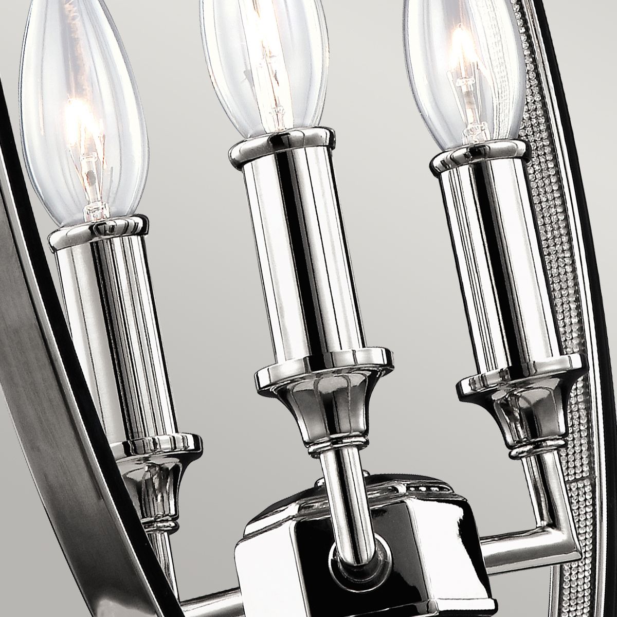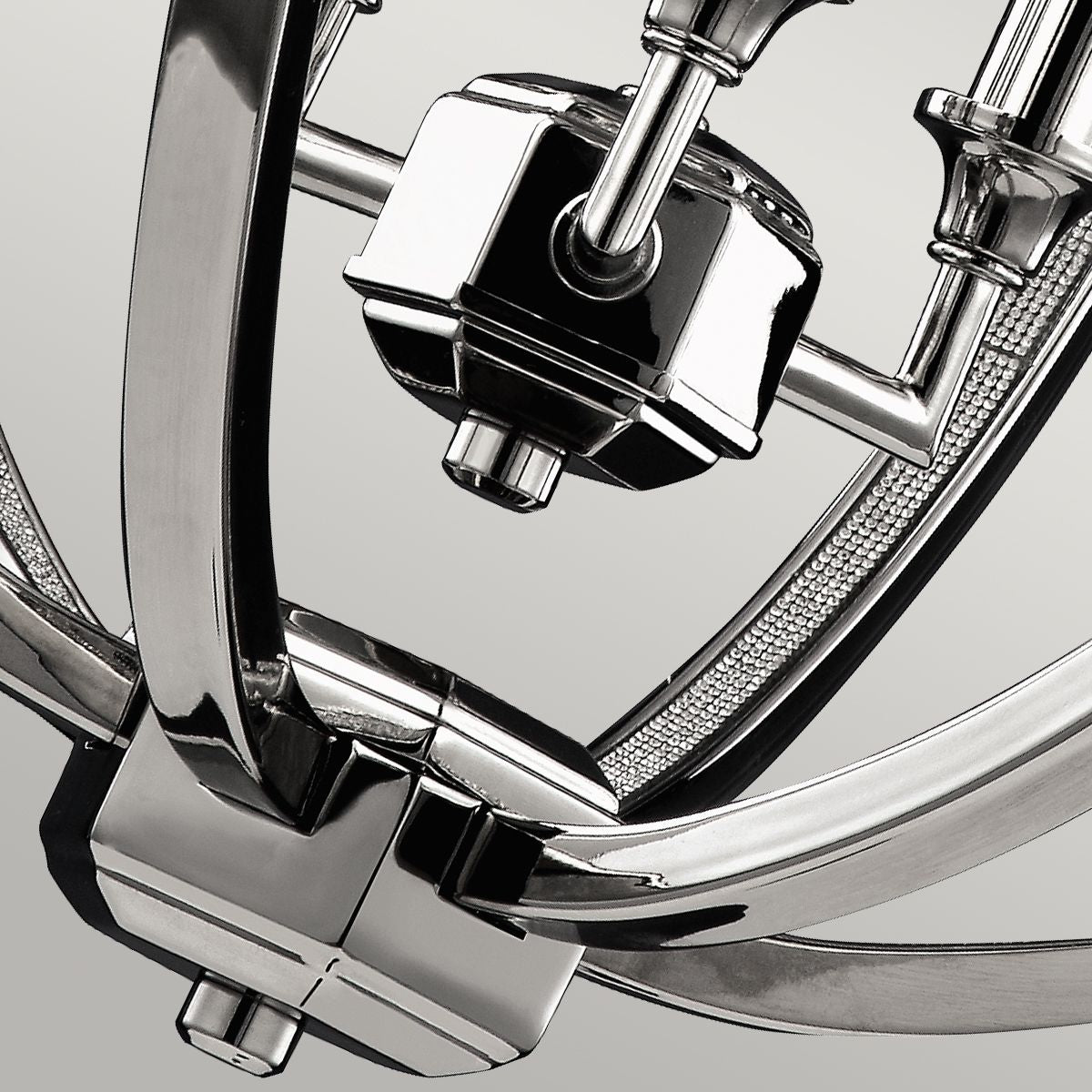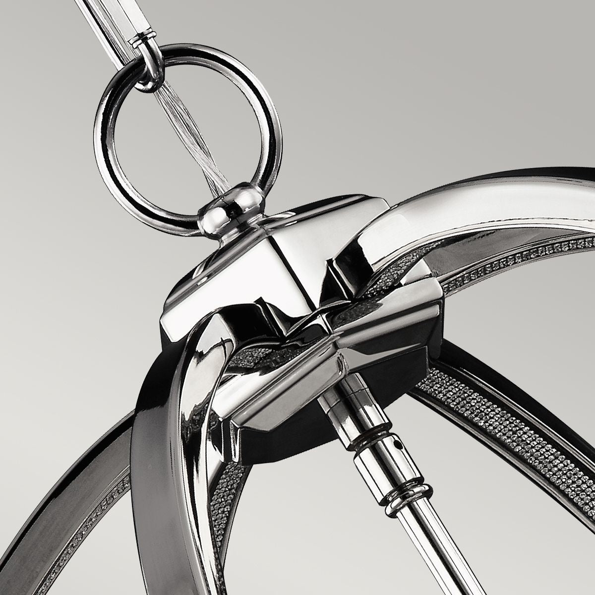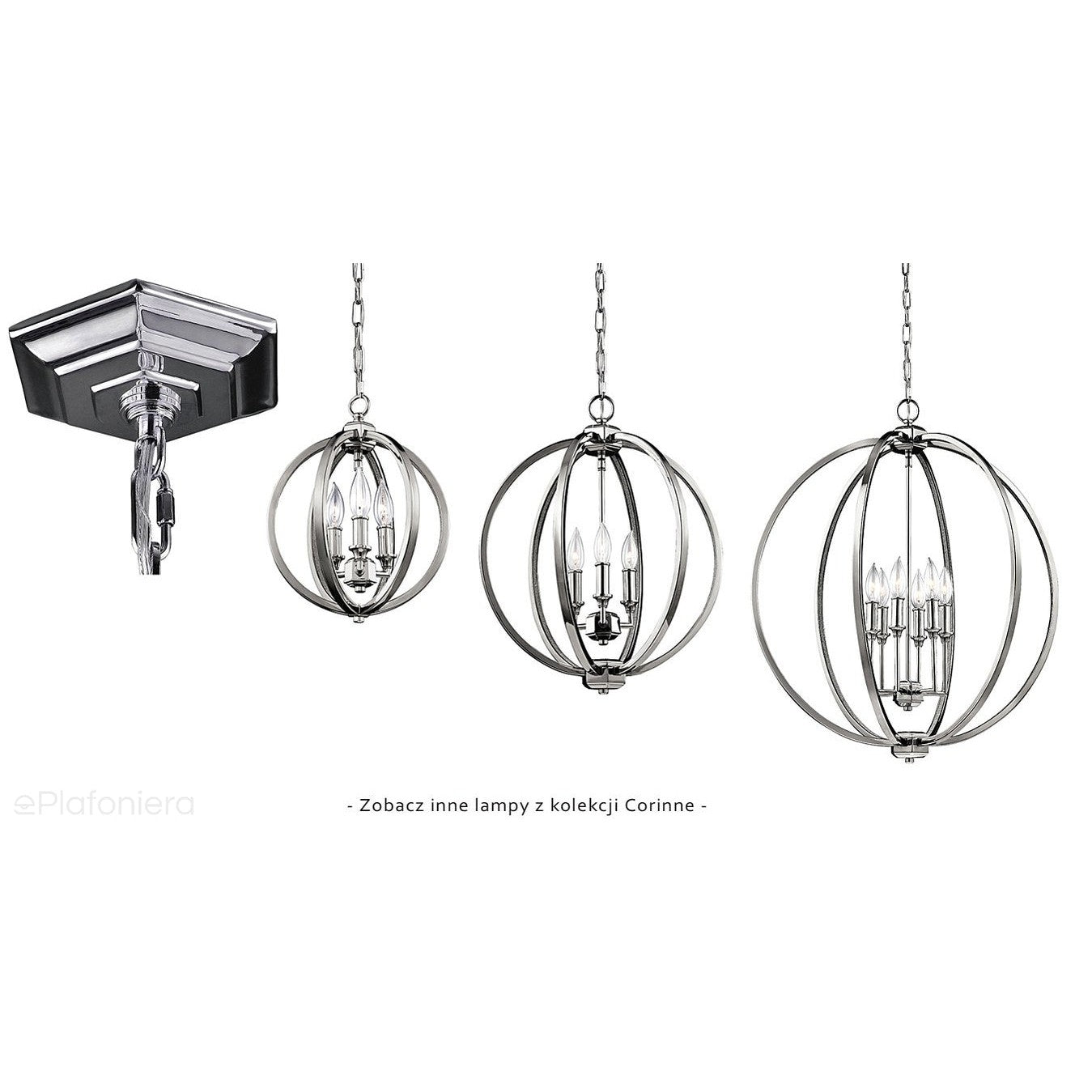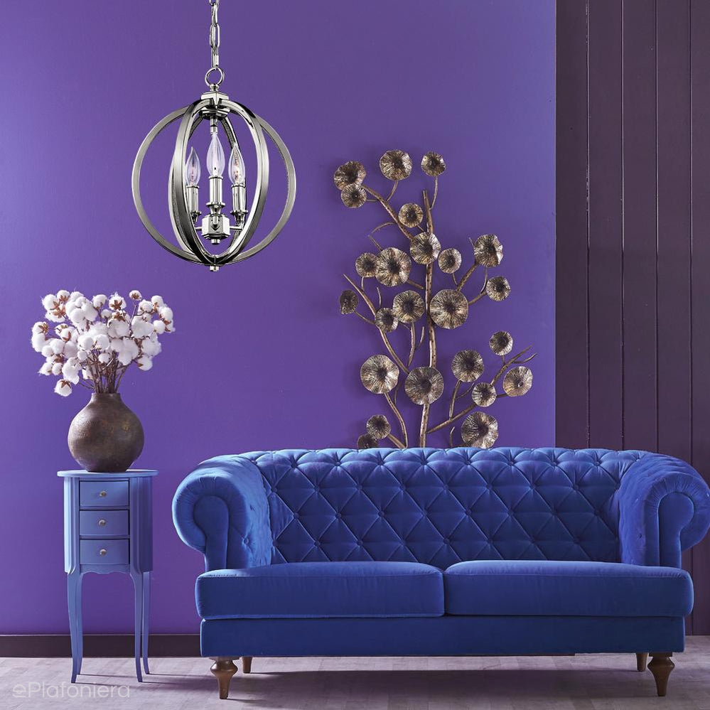 Nowoczesna średnia lampa wisząca na łańcuchu, ażurowa kula złożona z trzech obręczy, wewnątrz której znajdują się trzy żarówki – świeczki, całość pokryta warstwą polerowanego niklu.