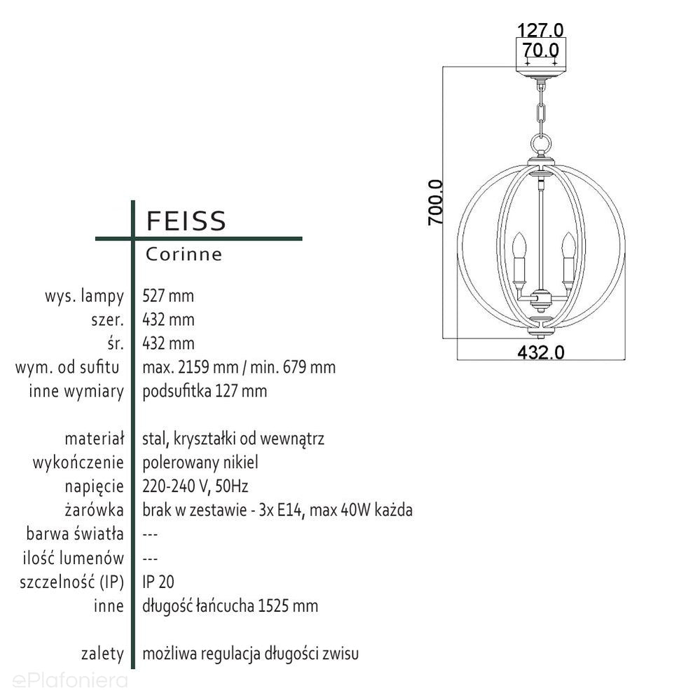 Metalowa lampa wisząca 43cm (ażurowa kula - nikiel) do kuchni salonu sypialni (3xE14) Feiss (Corinne)