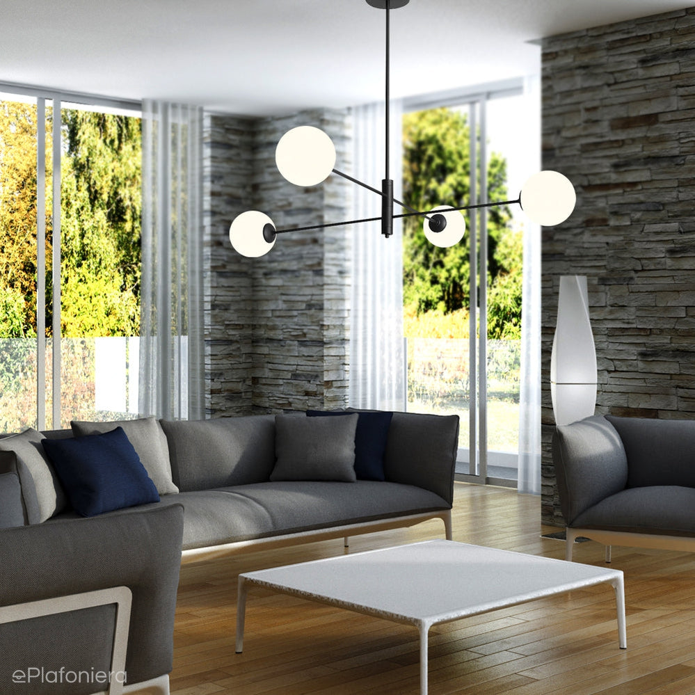 Nowoczesny, o bardzo modnym wyglądzie żyrandol, cztery, białe, szklane kule na czarnej rurce i stelażu złożonym z trzech pod różnym kątem przechodzących przez rurkę prętów.