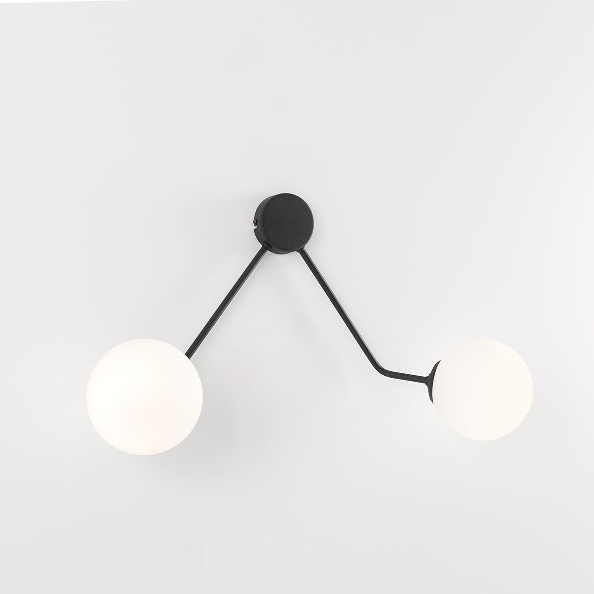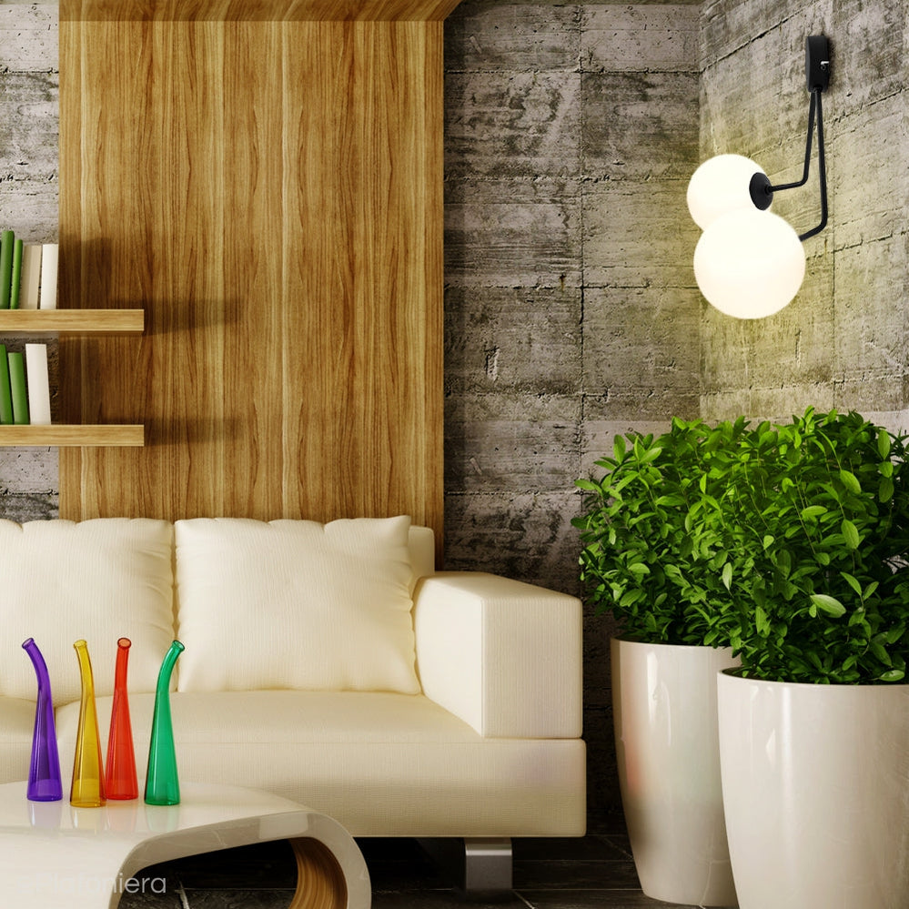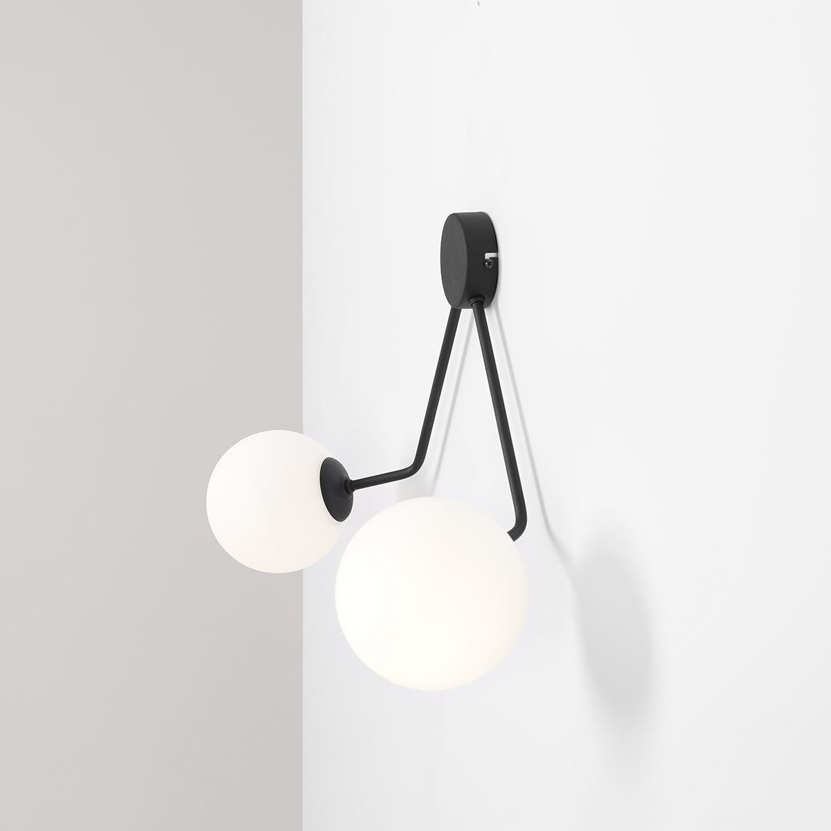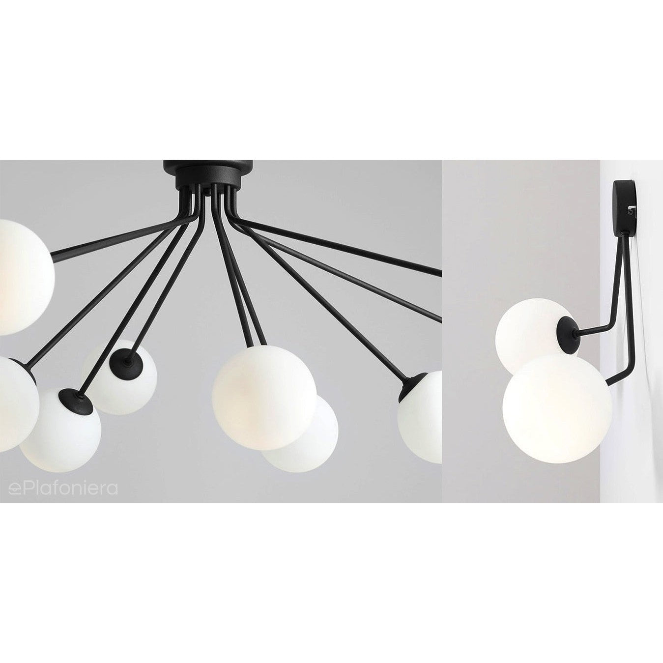 Nowoczesny kinkiet, designerski, ale minimalistyczny, białe, szklane kule na końcu czarnych wygiętych ramion.