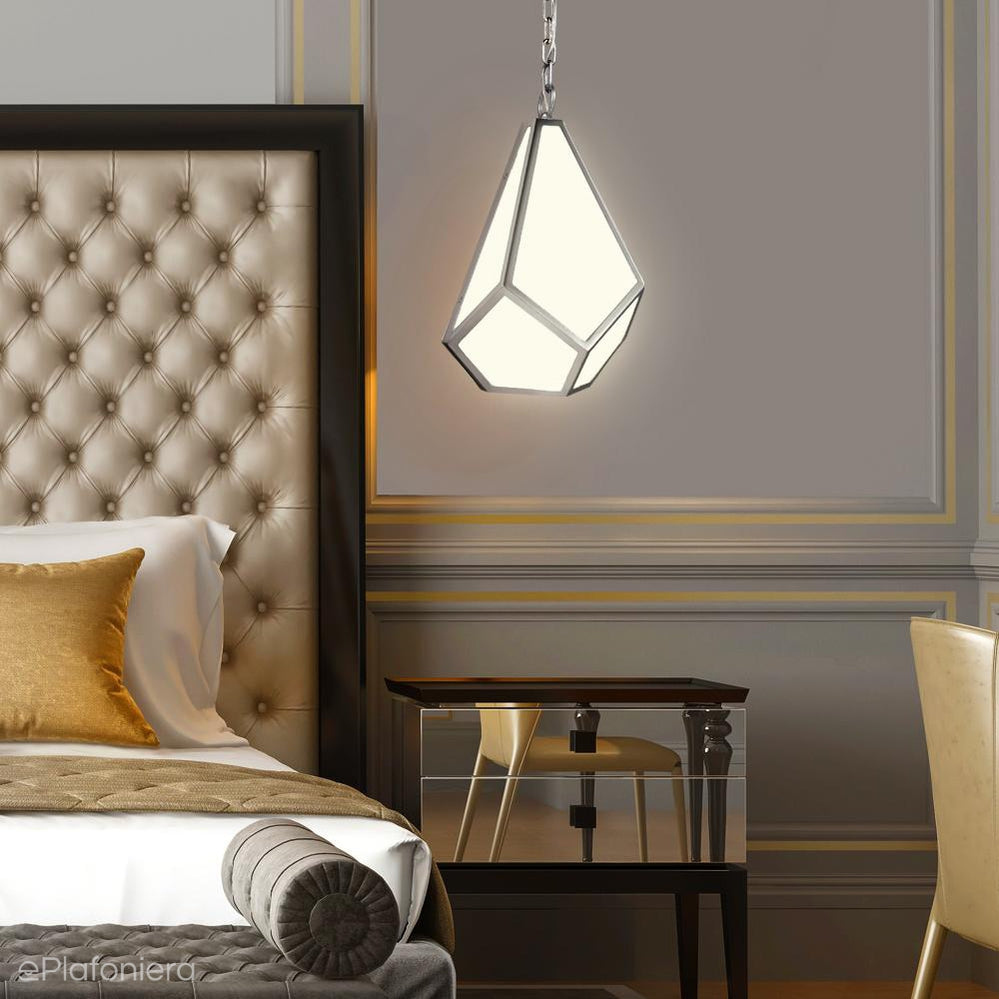 Nowoczesna, elegancka lampa wisząca na łańcuchu, duży witrażowy klosz złożony z białych akrylowych ścianek oprawionych w niklowane, stalowe ramki, zamyka we wnętrzu żarówkę.
