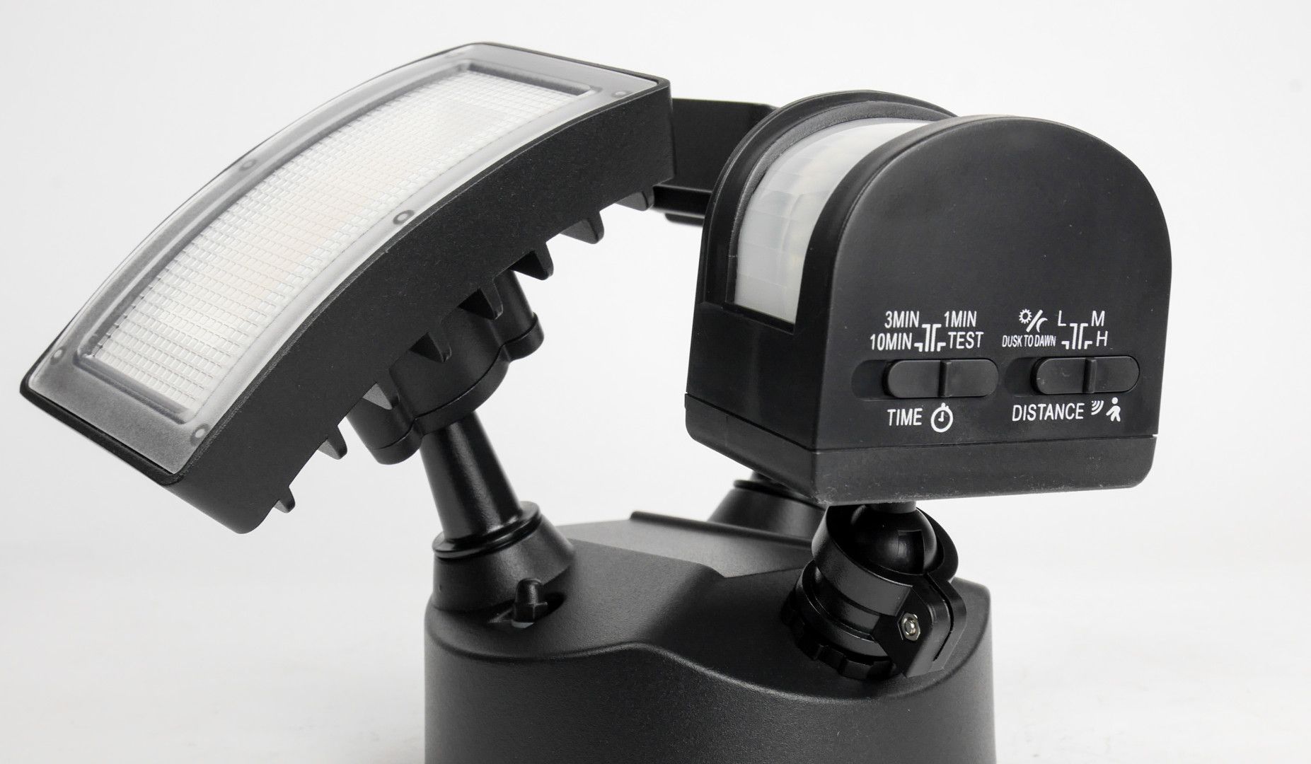 Nowoczesny kinkiet zewnętrzny o IP 54, podwójny reflektor z czujnikiem zmierzchu oraz ruchu, z możliwością regulacji czasu i odległości działania oraz dwiema oddzielnymi głowicami pozwalającymi skierować strumień światła w dowolnym kierunku, o wymiarach – wysokość 19,8 cm, szerokość 25,4 cm, głębokość 14,3 cm.