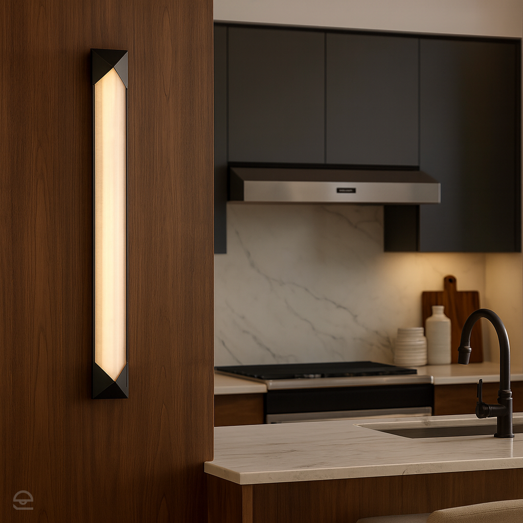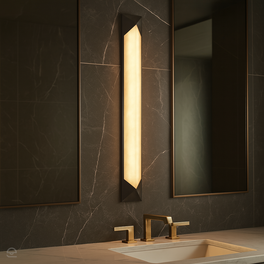 Duży kinkiet LED z kolekcji Caesar to smukła, wertykalna forma z geometrycznym akcentem. Wydłużony klosz z alabastru osadzony został między trójkątnymi detalami w wykończeniu miejski brąz. Subtelne światło przenikające przez kamień tworzy nastrojową aurę – idealną do holi, klatek schodowych lub nowoczesnych wnętrz mieszkalnych. *Alabaster cechuje się wyraźnymi różnicami w użyleniu i odcieniu – to unikalna cecha tego ponadczasowego, naturalnego materiału. Nie ma dwóch identycznych egzemplarzy.