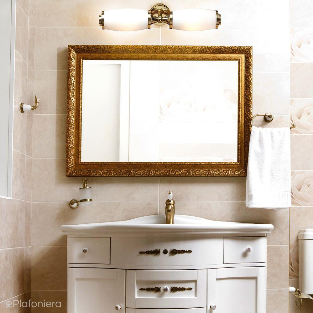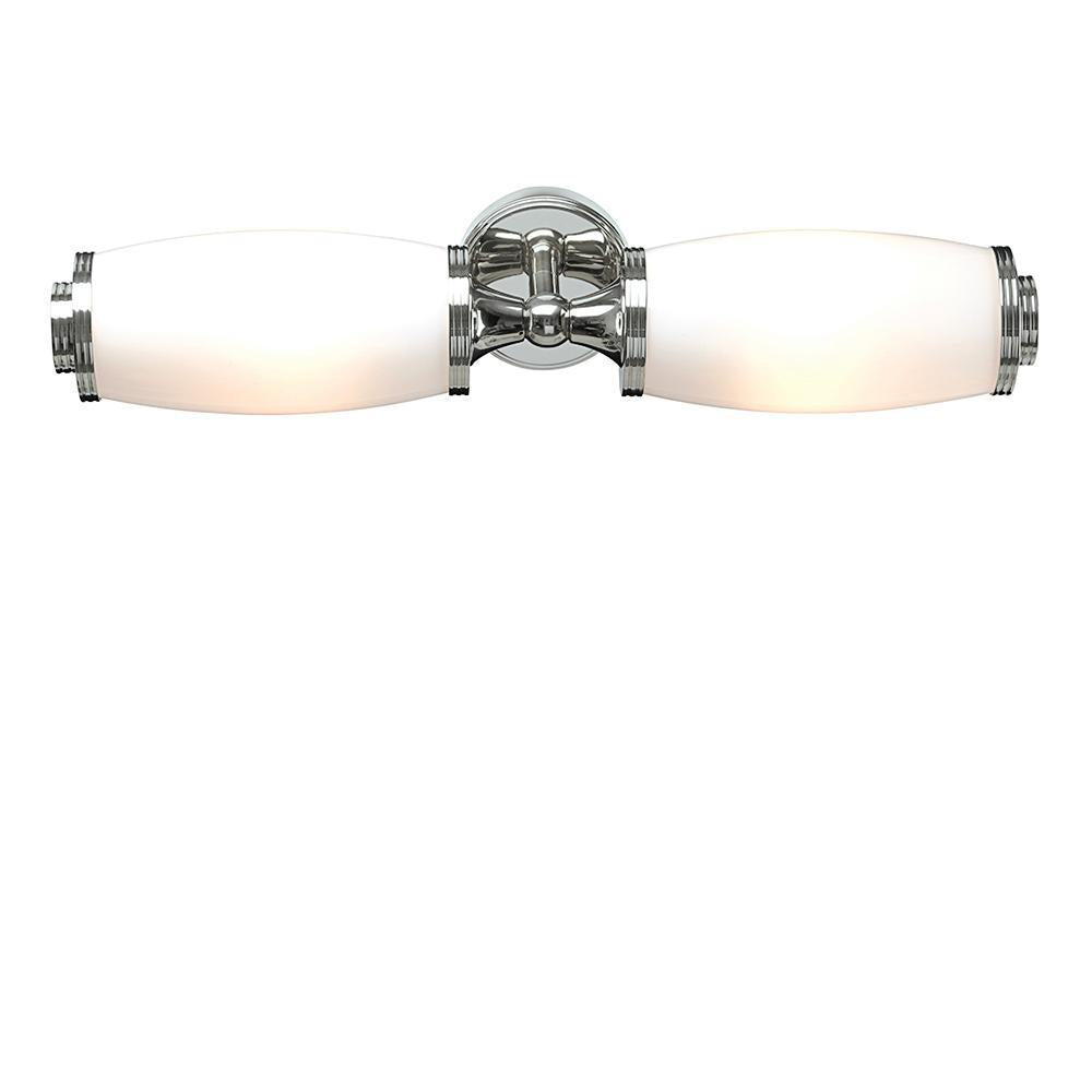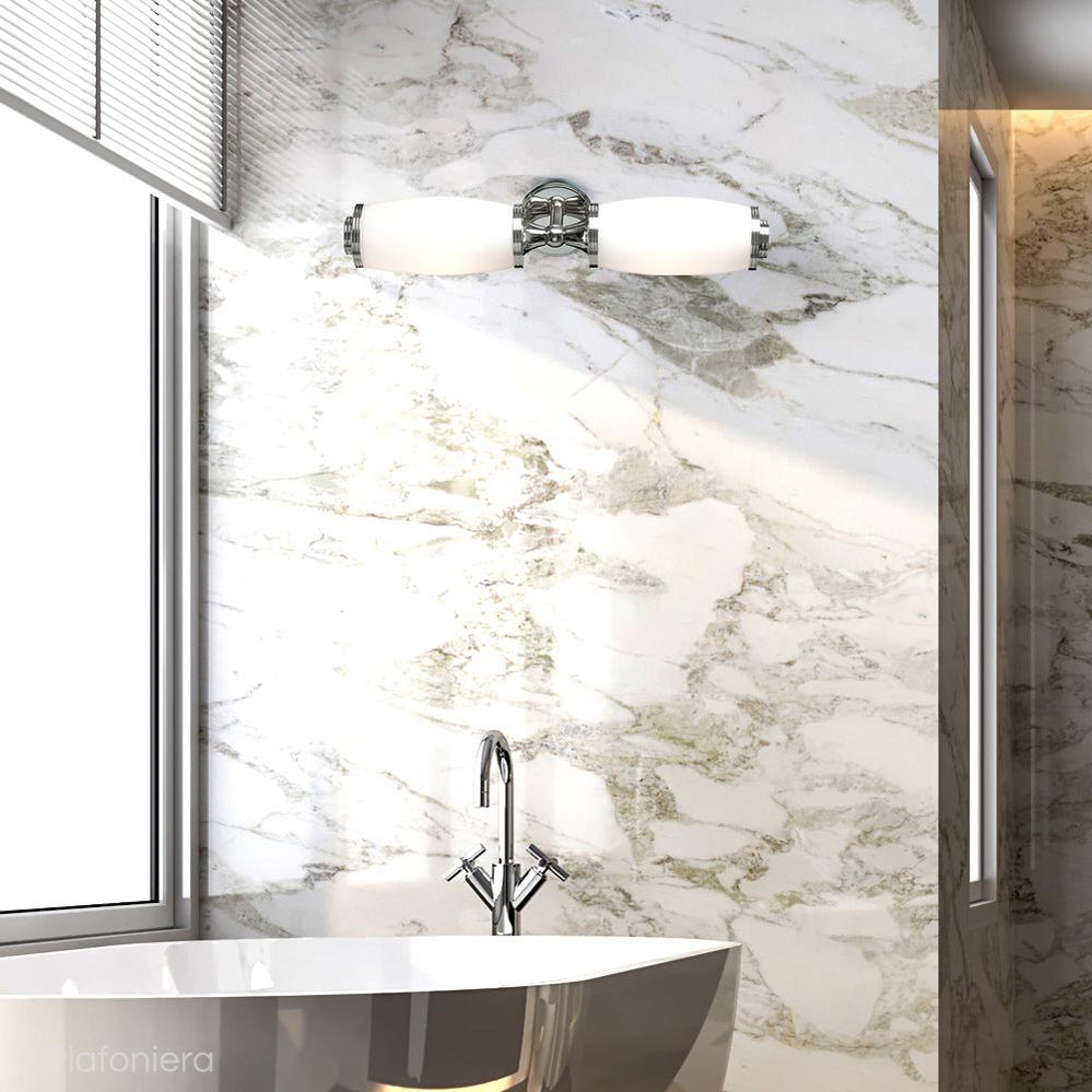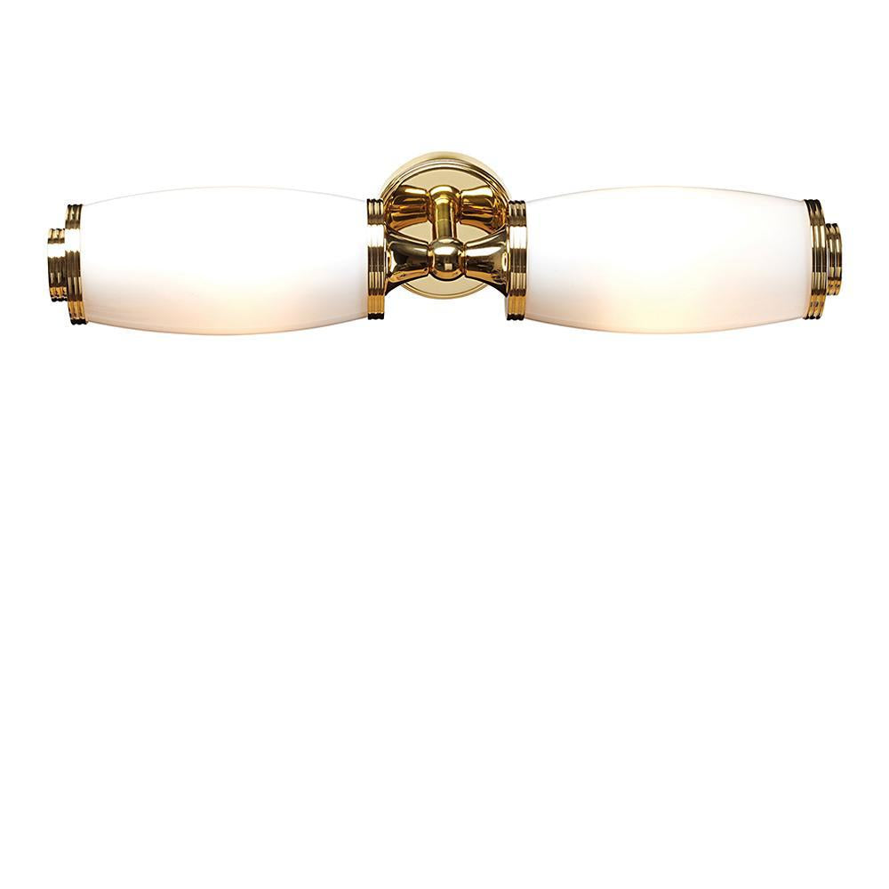 Nowoczesny kinkiet poziomy w klasycznym wydaniu, polerowany mosiądz lub chrom w połączeniu ze szklanym wrzecionowatym podwójnym kloszem oraz stopniem szczelności IP 44 dedykowany do łazienki, świetnie sprawdzi się nad lustro, nad obraz lub na ścianie, ale pasuje również do salonu, jadalni, sypialni czy holu.