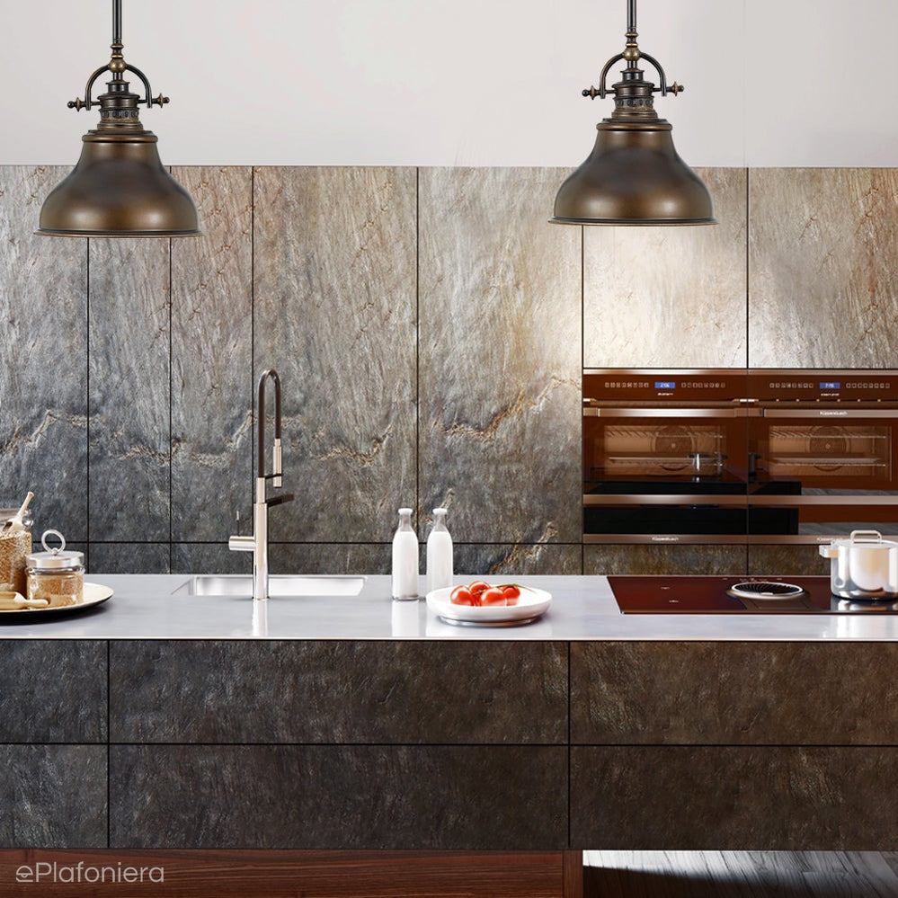 Industrialna lampa wisząca na rurce (w zestawie cztery rurki do regulacji długości), całość z metalu w kolorze brązu, dzwonkowaty klosz zakończony jest od dołu szklanym dyfuzorem, który idealnie rozprasza światło.