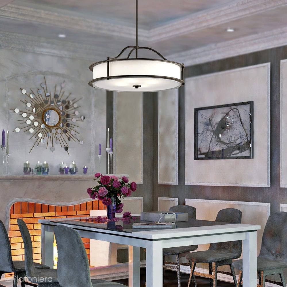 Stylowa, klasyczna lampa wisząca na rurce (w zestawie cztery rurki do regulacji długości lub możliwość zamontowania lampy bez rurek w formie plafoniery), delikatna, prosta oprawa w kolorze starego brązu, ze szklanym, białym abażurem – walcem, zamkniętym od dołu dyfuzorem, na cztery żarówki.