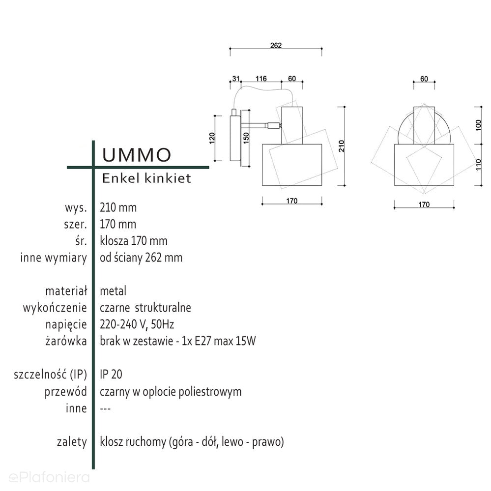 - inne: możliwa regulacja klosza (lewo - prawo, góra - dół)