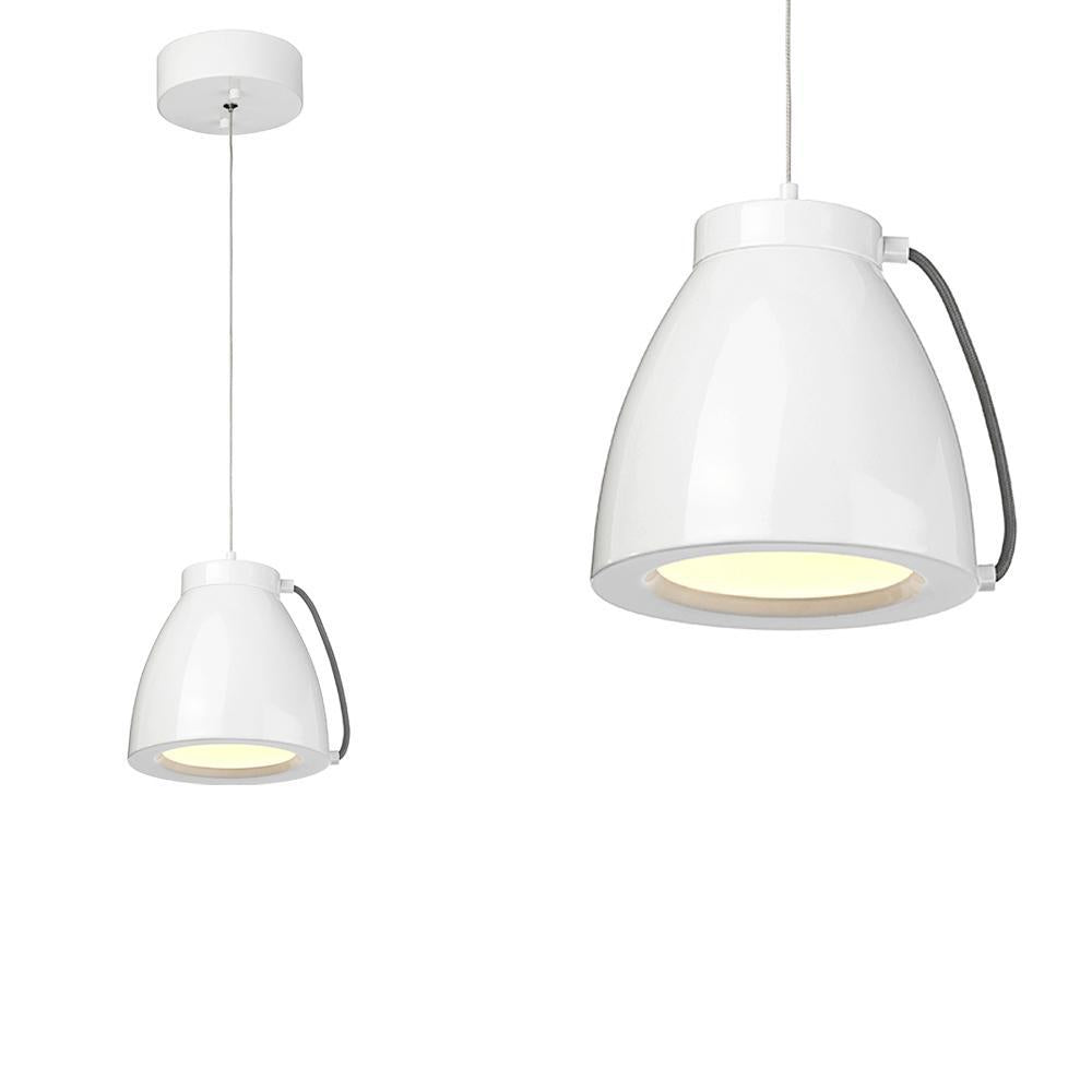 Modernistyczna lampa LED, wisząca, o regulowanej wysokości, pojedyncza, biały metalowy klosz na białym kablu.