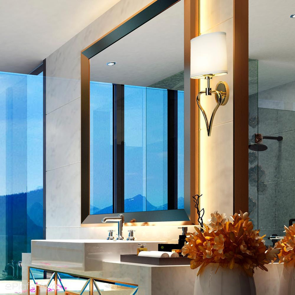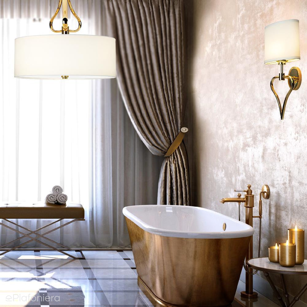 Elegancki, romantyczny kinkiet z białym spłaszczonym abażurem na konstrukcji w kształcie serca w kolorze francuskiego złota, o podwyższonym stopniu szczelności IP 44 – bezpieczna również w pomieszczeniach o dużej wilgotności.