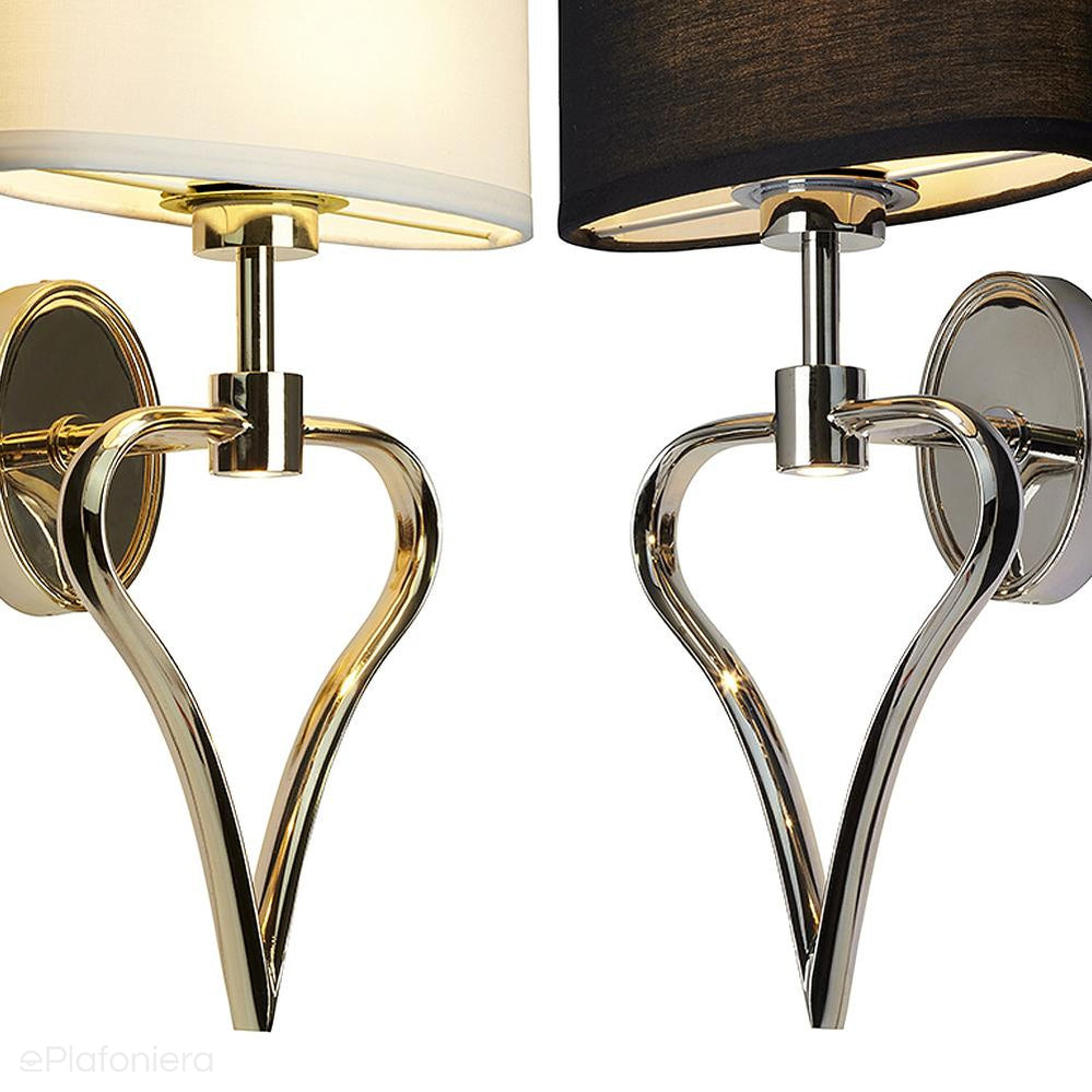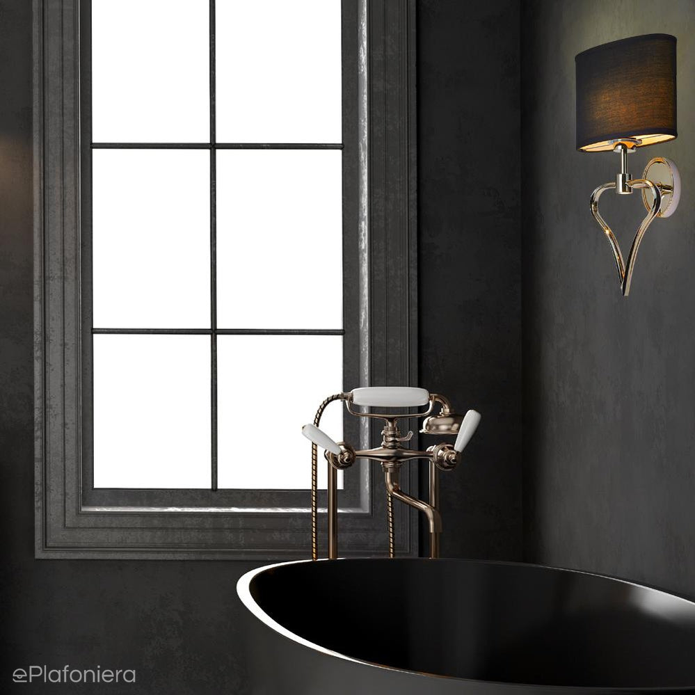 Elegancki, romantyczny kinkiet z czarnym spłaszczonym abażurem na konstrukcji w kształcie serca w kolorze chromowym, o podwyższonym stopniu szczelności IP 44 – bezpieczna również w pomieszczeniach o dużej wilgotności.