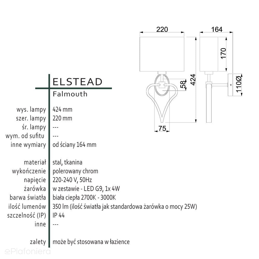 Romantyczny kinkiet do łazienki Falmouth IP44 - Elstead (czarny, polerowany chrom)