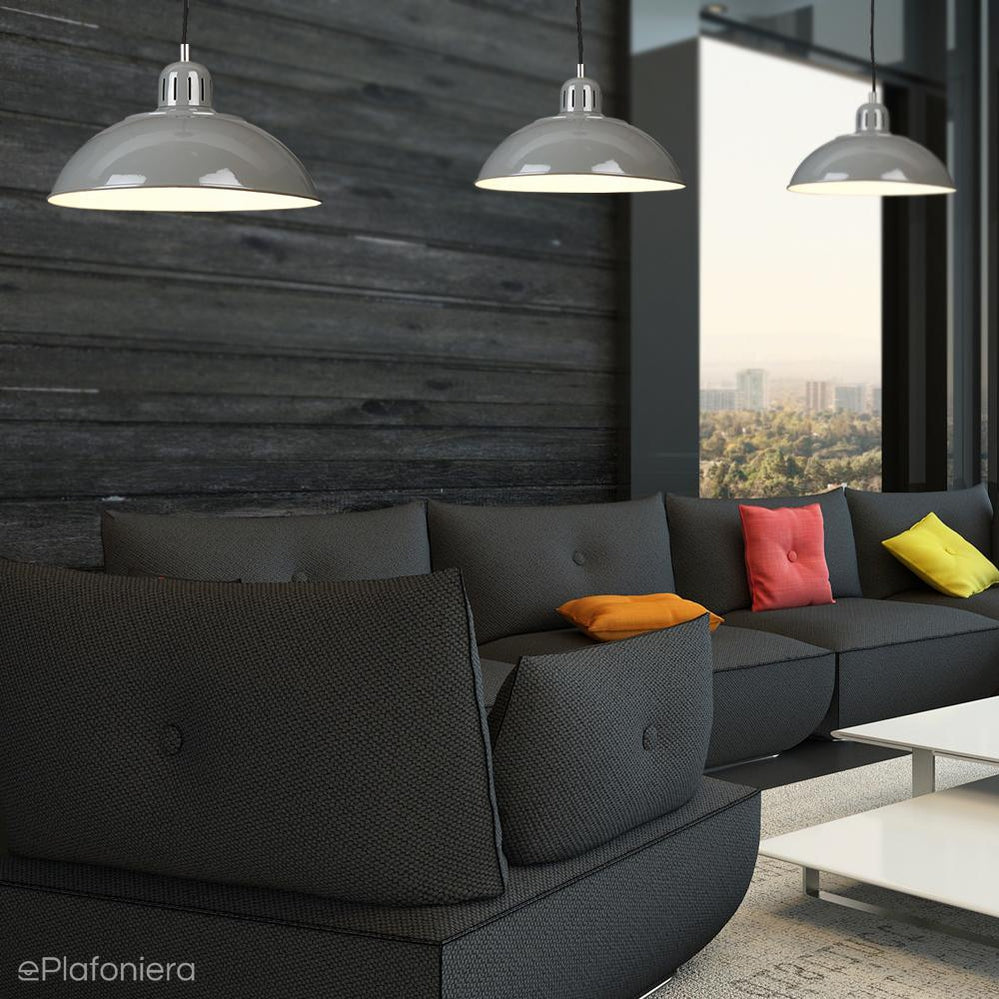 Nowoczesna lampa wisząca, pojedyncza, inspirowana stylem retro, klosz ze stali w kolorze szarym na czarnym kablu w oplocie.
