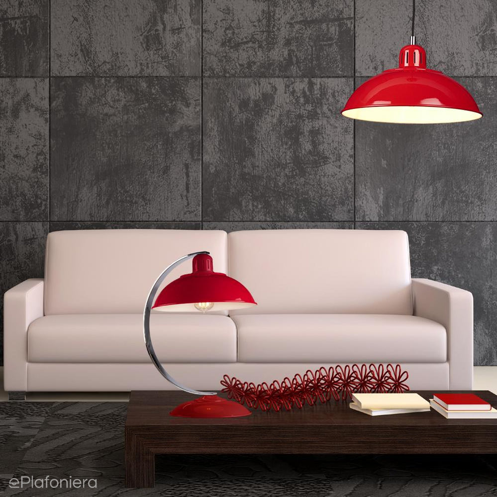 Nowoczesna lampa wisząca, pojedyncza, inspirowana stylem retro, klosz ze stali w kolorze czerwonym na czarnym kablu w oplocie.
