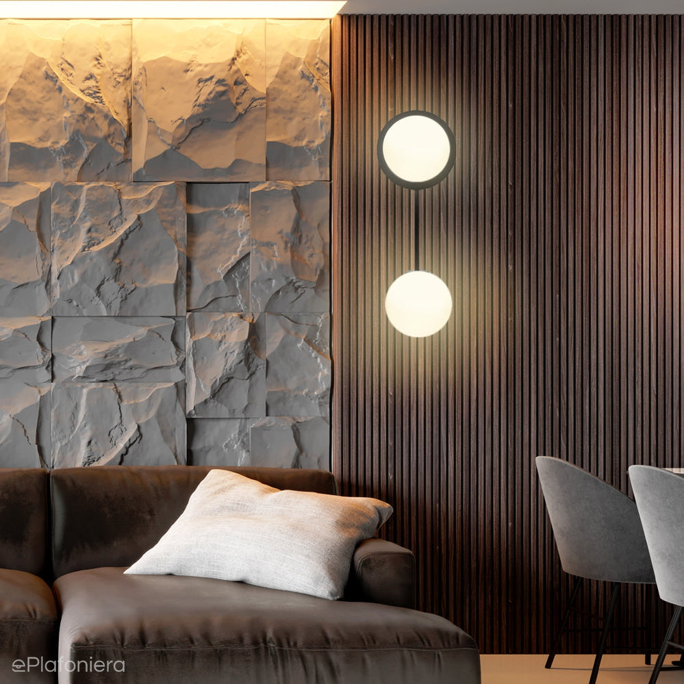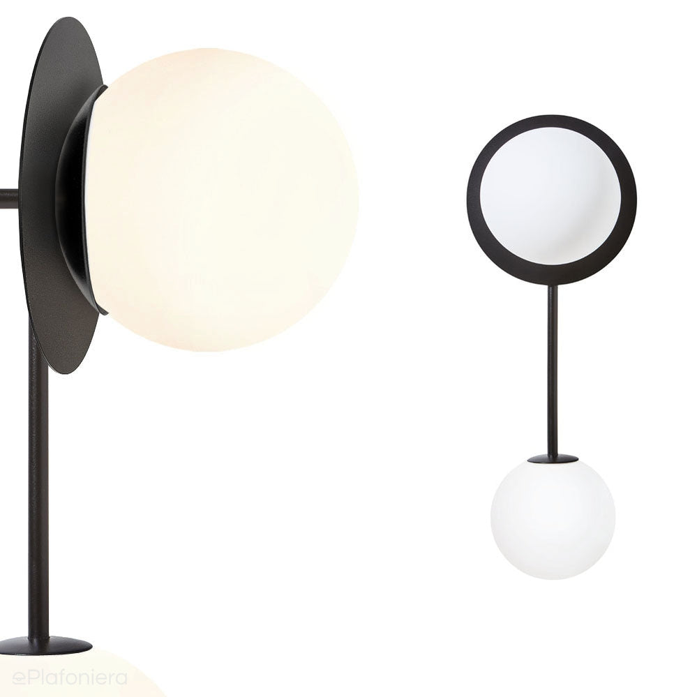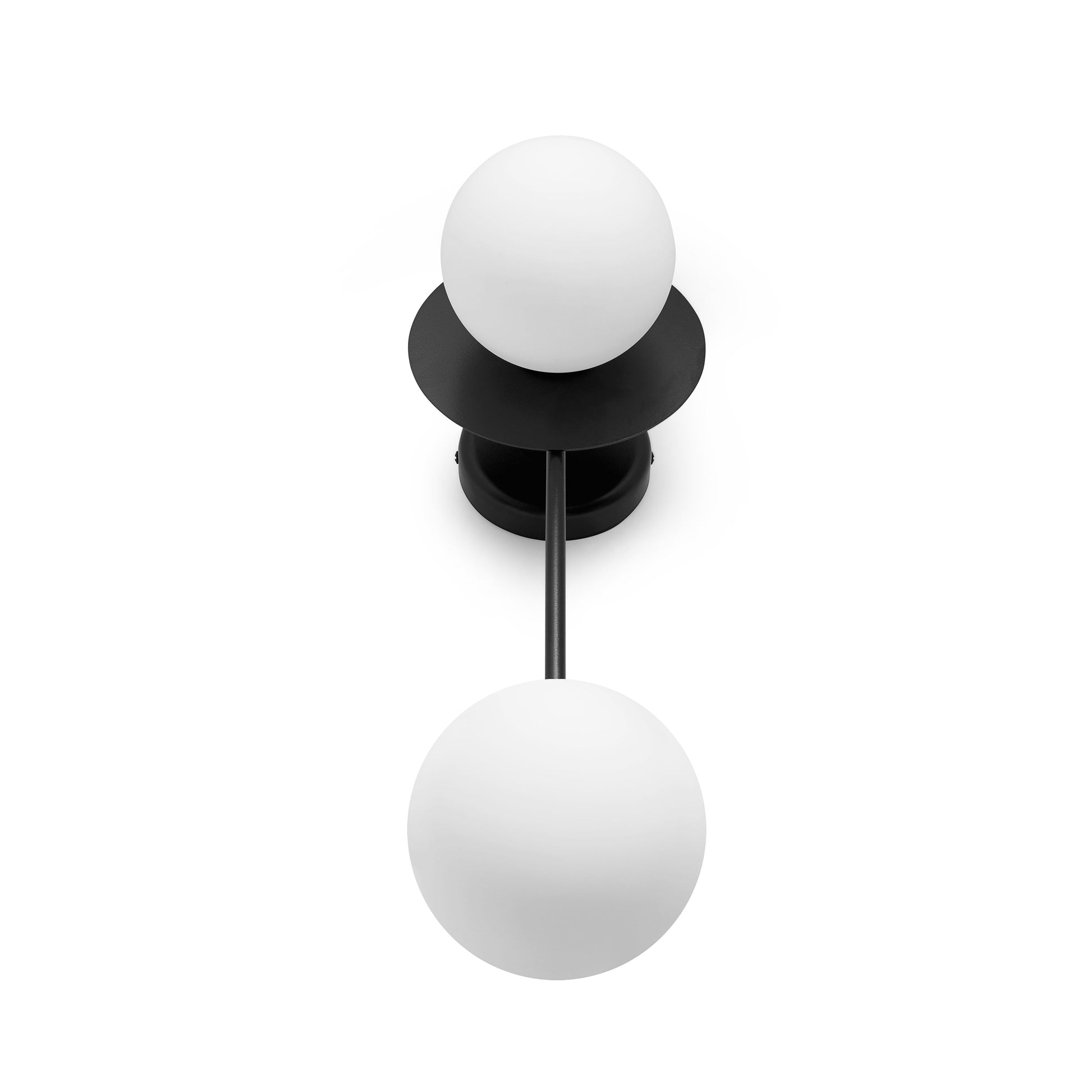 Nowoczesny kinkiet, dwa białe, szklane klosze – kule, umieszczone w linii prostej, jeden nad drugim, na czarnym, lakierowanym stelażu.