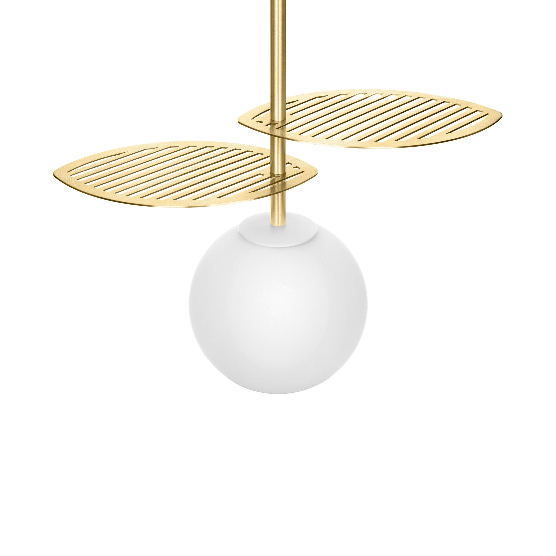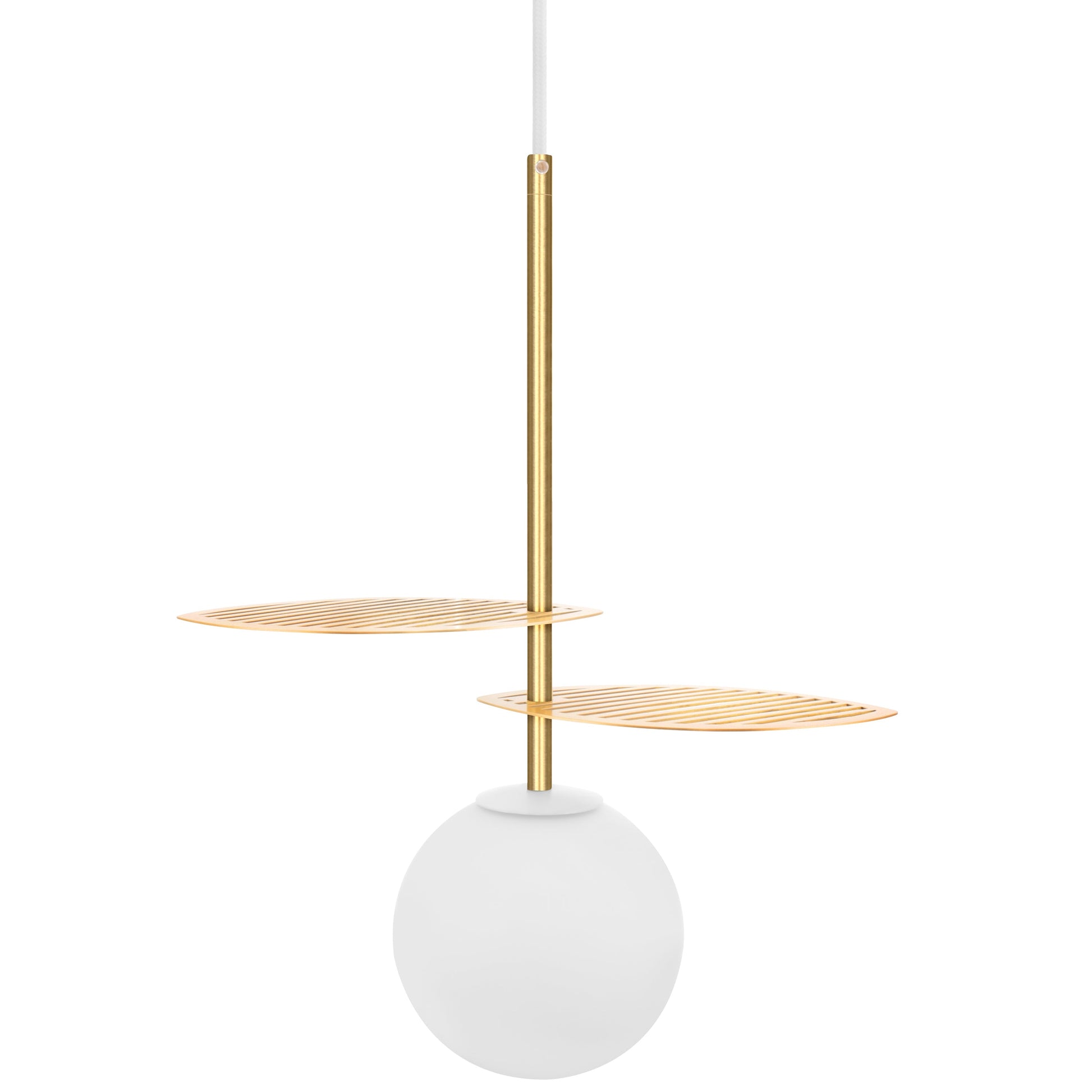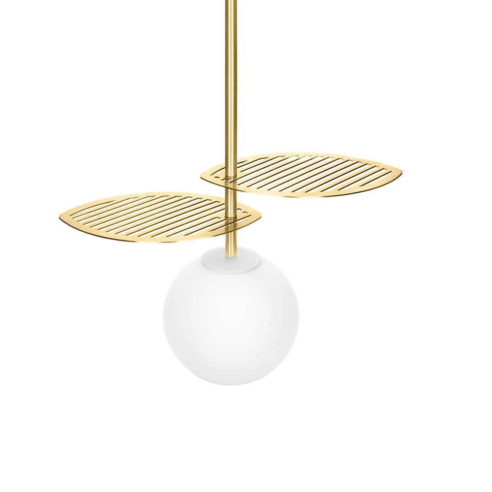 Nowoczesna lampa wisząca na kablu w oplocie białym, inspirowana naturą, klosz to biała szklana kula pod dwoma ażurowymi liśćmi wokół rurki wykonanymi z mosiądzu.