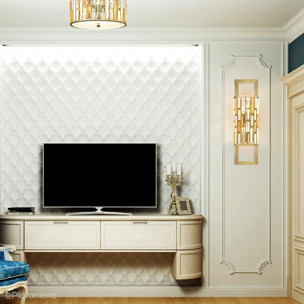 Nowoczesna kinkiet, szklany klosz – półwalec, złożony z wielu prostokątnych, przezroczystych i bursztynowych kryształów, umocowanych na lakierowanej złotej, metalowej konstrukcji, na dwie żarówki, świeci w górę i w dół.