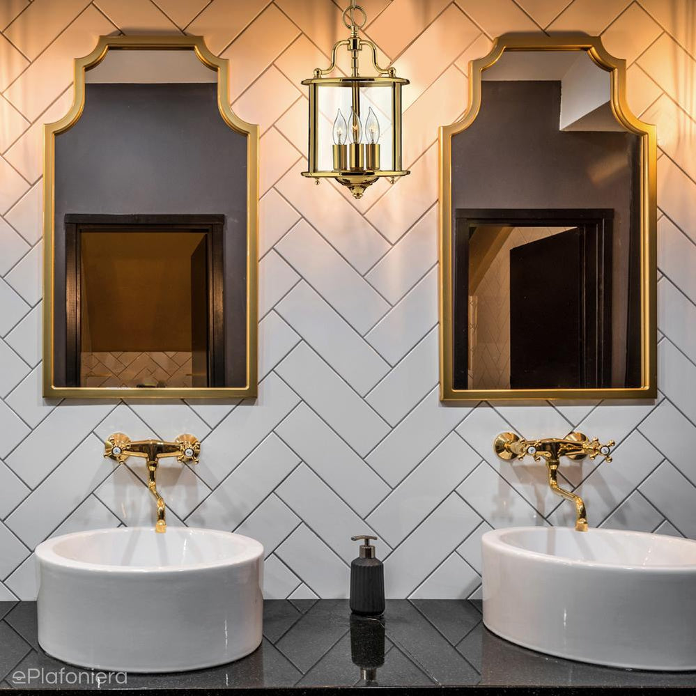 Klasyczna lampa wisząca na łańcuchu o bardzo tradycyjnej formie latarni, przezroczyste szkło, mosiężna rama z dekoracyjnymi elementami, a wewnątrz podstawa dla trzech żarówek – świeczek.