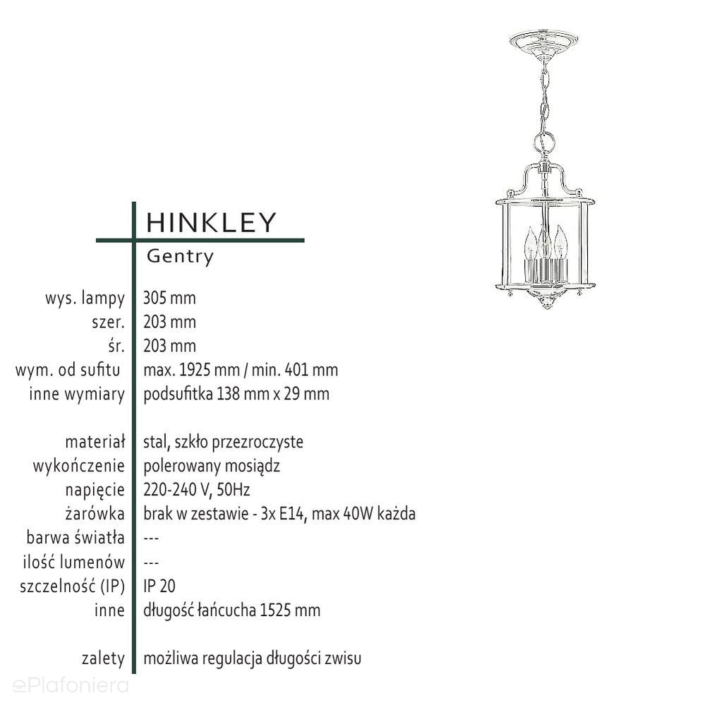 Wisząca latarnia Gentry z mosiądzem - Hinkley, lampa wisząca z łańcuchem (20cm, 3xE14)