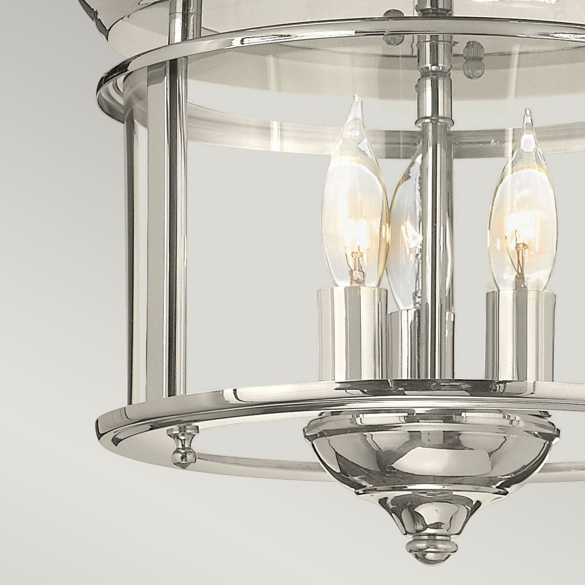 Klasyczna plafoniera o bardzo tradycyjnej formie latarni, przezroczyste szkło, niklowana rama z dekoracyjnymi elementami, a wewnątrz podstawa dla trzech żarówek – świeczek.