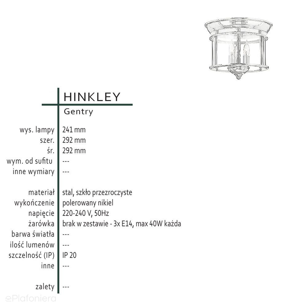 Sufitowa latarnia 29cm (nikiel) lampa - plafon do salonu kuchni sypialni łazienki (3xE14) Hinkley (Gentry)