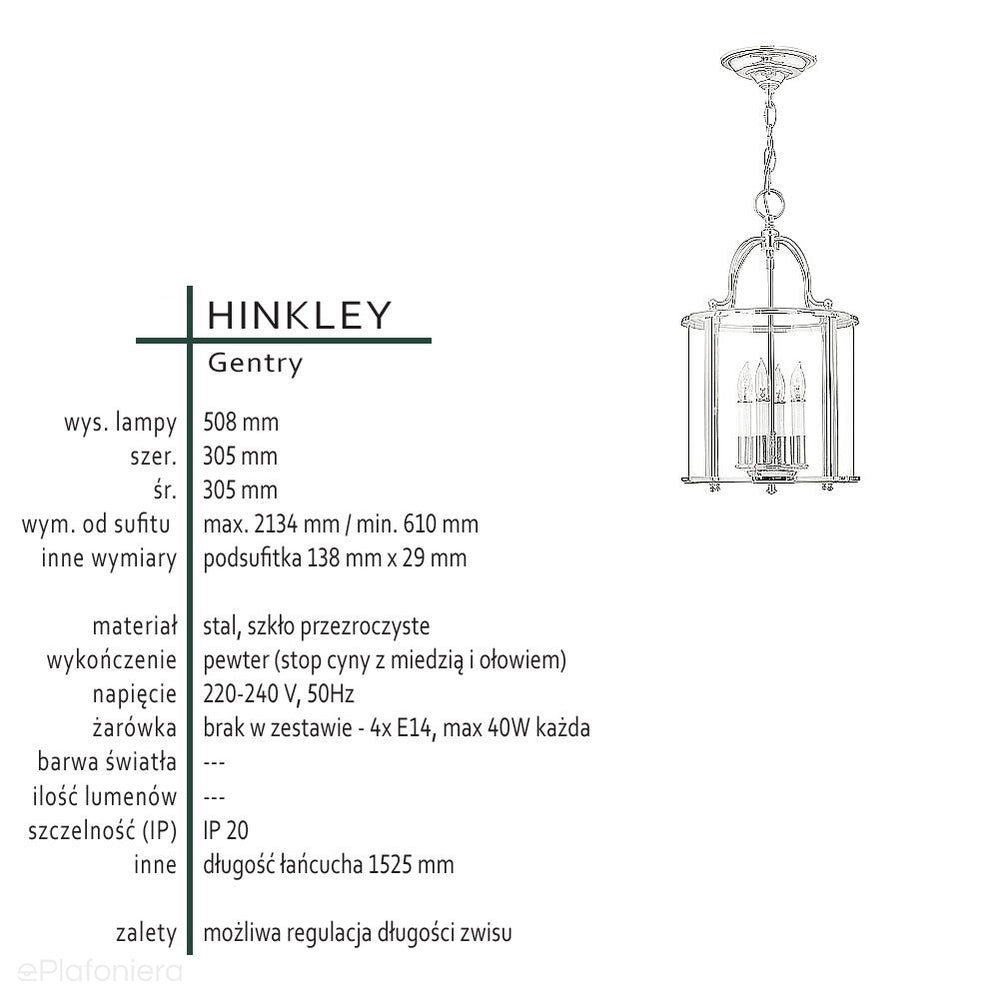 Wisząca latarnia 30cm (pewter) lampa do salonu kuchni sypialni łazienki (4xE14) Hinkley (Gentry)