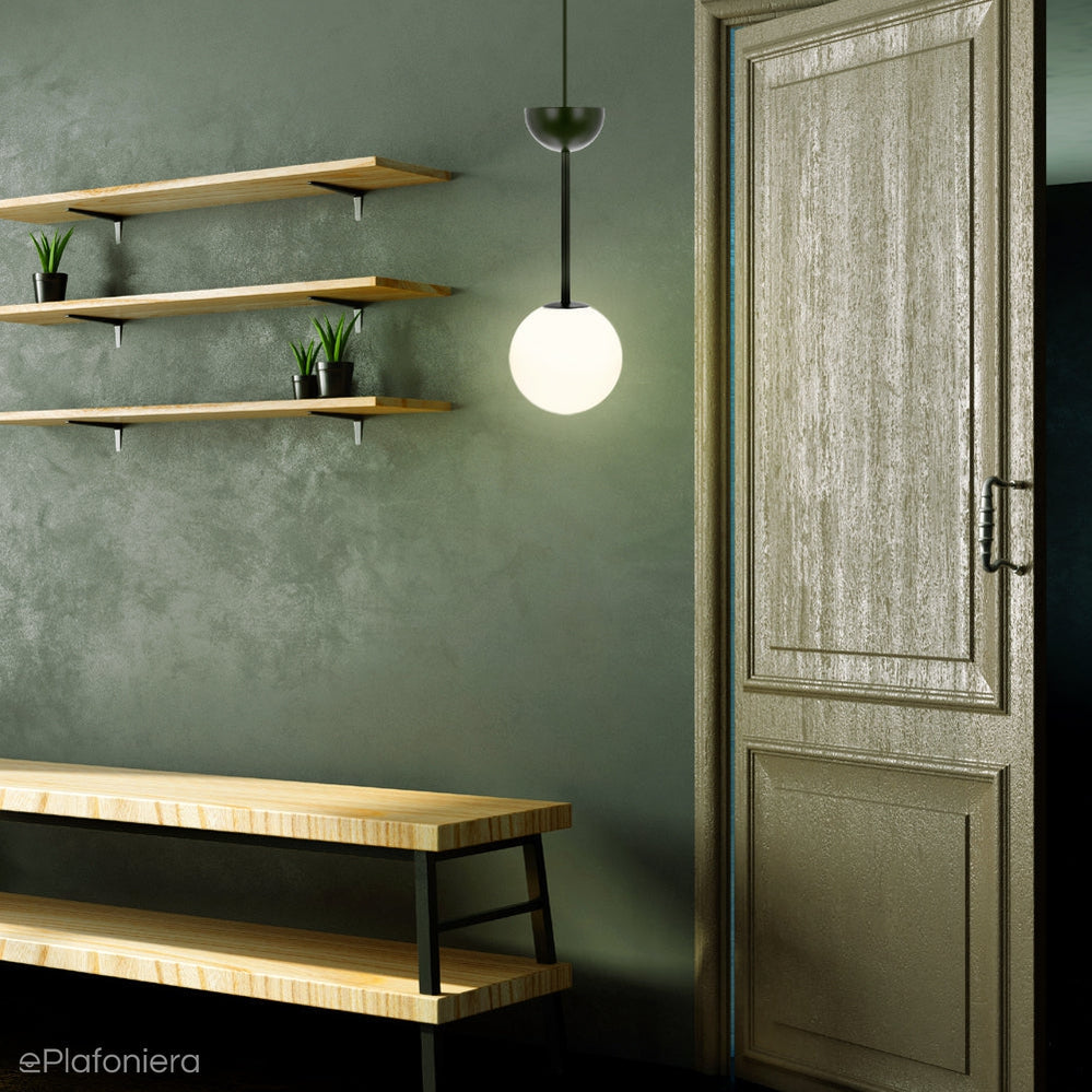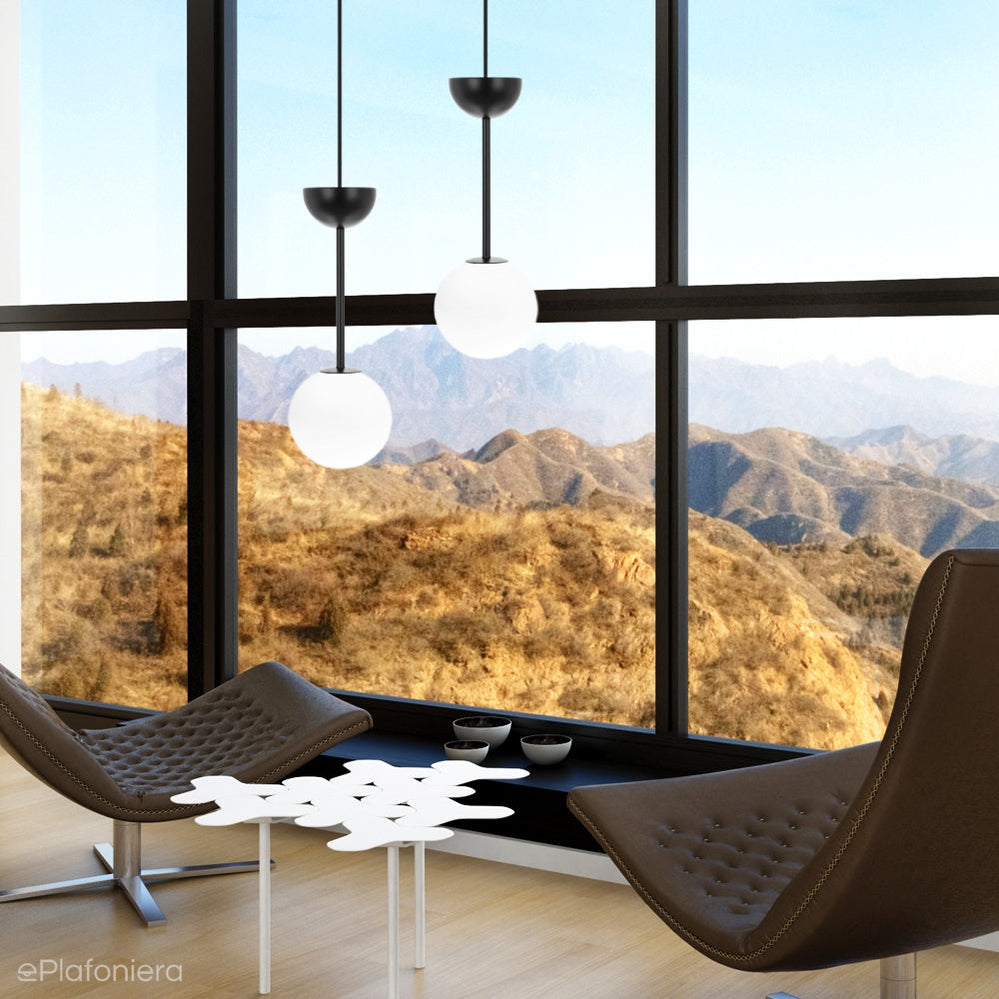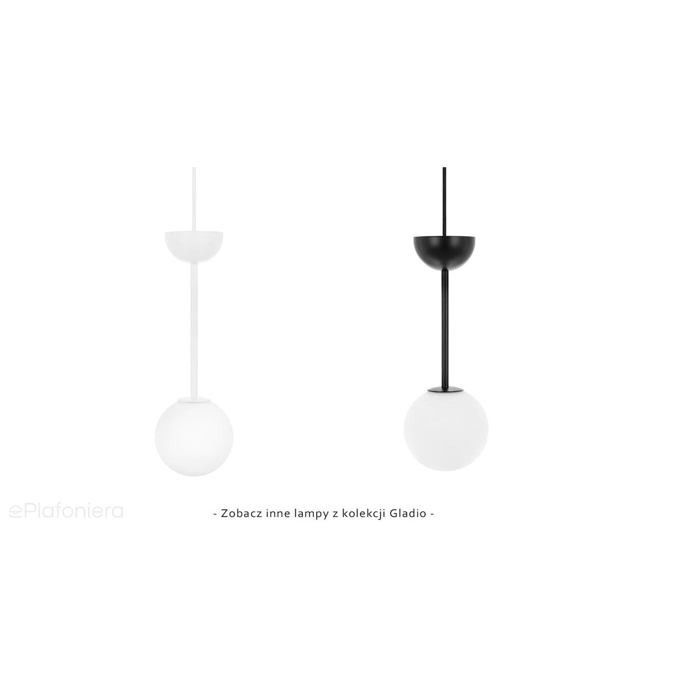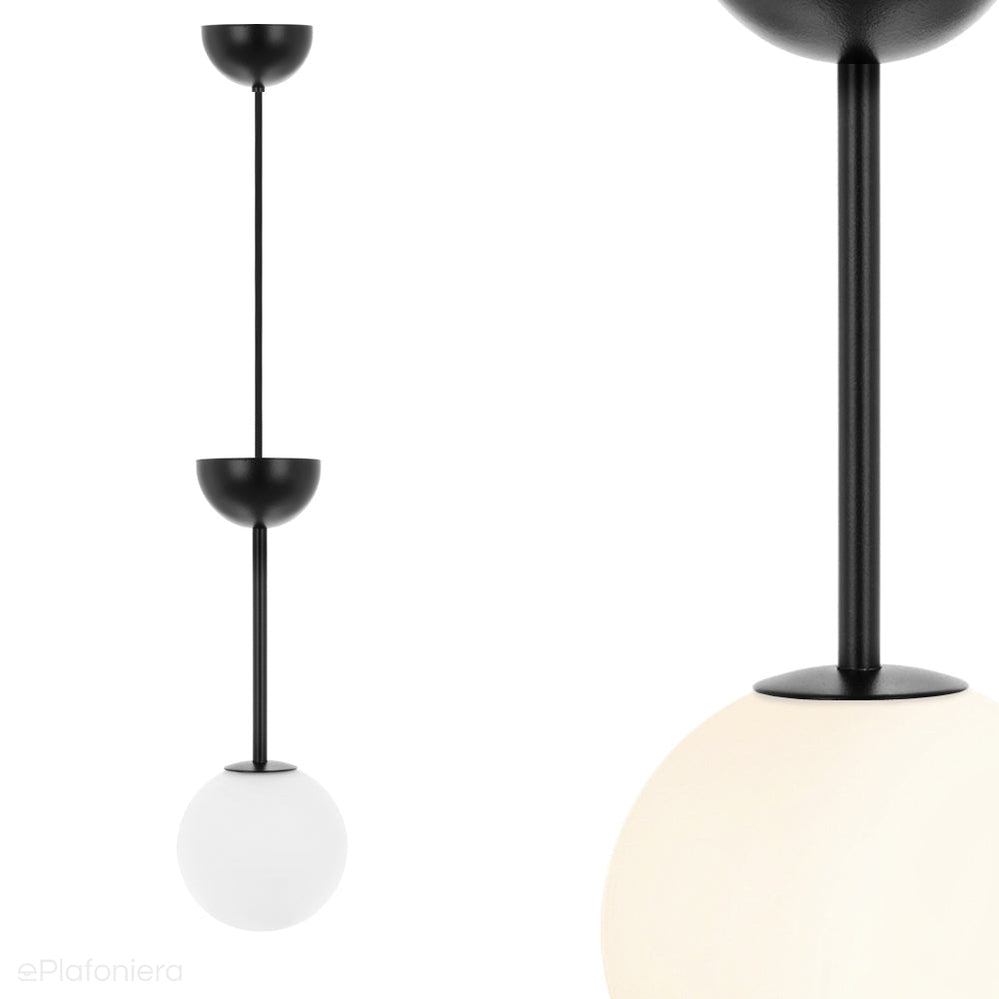 Nowoczesna lampa wisząca, minimalistyczny design w klasycznym kolorze czerni, z białym matowym kloszem – szklaną kulą, na rurce, która oplata kabel w tym samym kolorze, do złudzenia przypomina miecz.