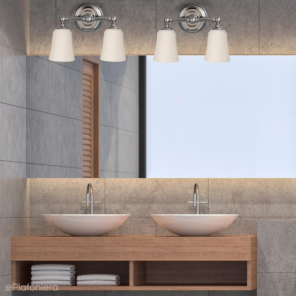 Nowoczesny kinkiet o podwyższonym stopniu szczelności IP 44, inspirowany stylem kolonialnym, dwa szklane, mleczne klosze, mogą być skierowane w górę lub w dół, na chromowanym ramieniu.