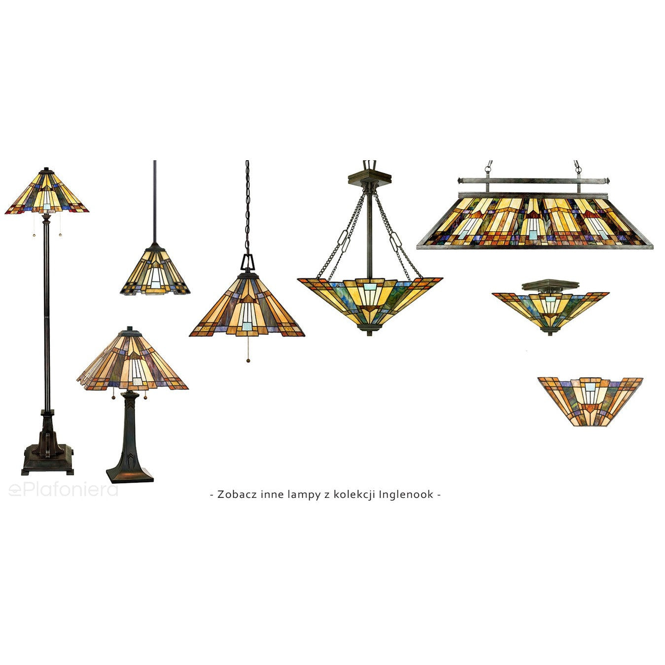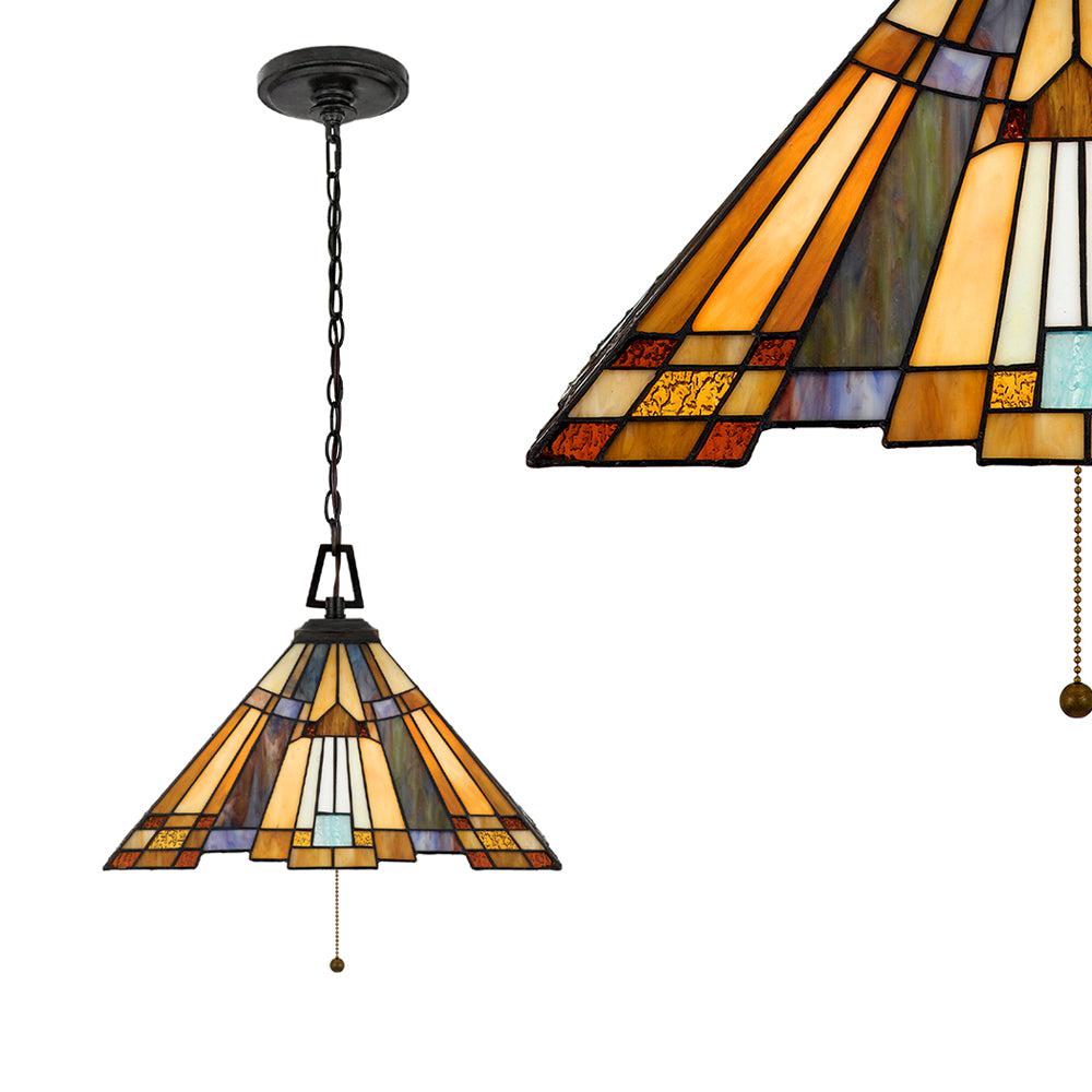 Lampa wisząca na łańcuchu w stylu Tiffany, na trzy żarówki, wywodzi się z lamp witrażowych stylu art deco, wykonanie ręczne, klosz ułożony z kawałków szkła w odcieniach bursztynu i karmelu. Charakterystyczne dla tej serii są linie proste tworzące prostokąty lub kwadraty.