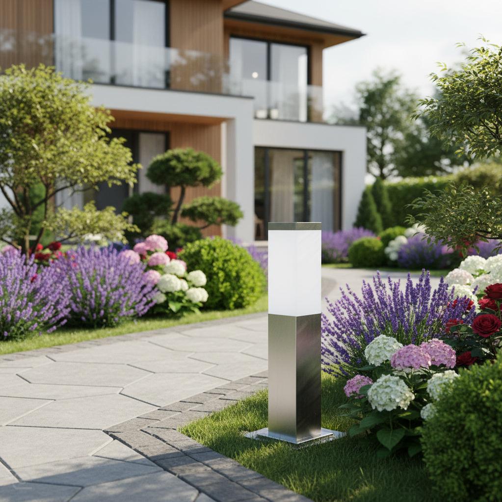 Nowoczesna, stojąca lampa zewnętrzna o IP 44, ogrodowa, przydomowo – przemysłowa ze stali nierdzewnej z białym kloszem, kwadratowy słupek o wymiarach – wysokość 48 cm lub 69 cm, szerokość 8 cm x 8 cm.