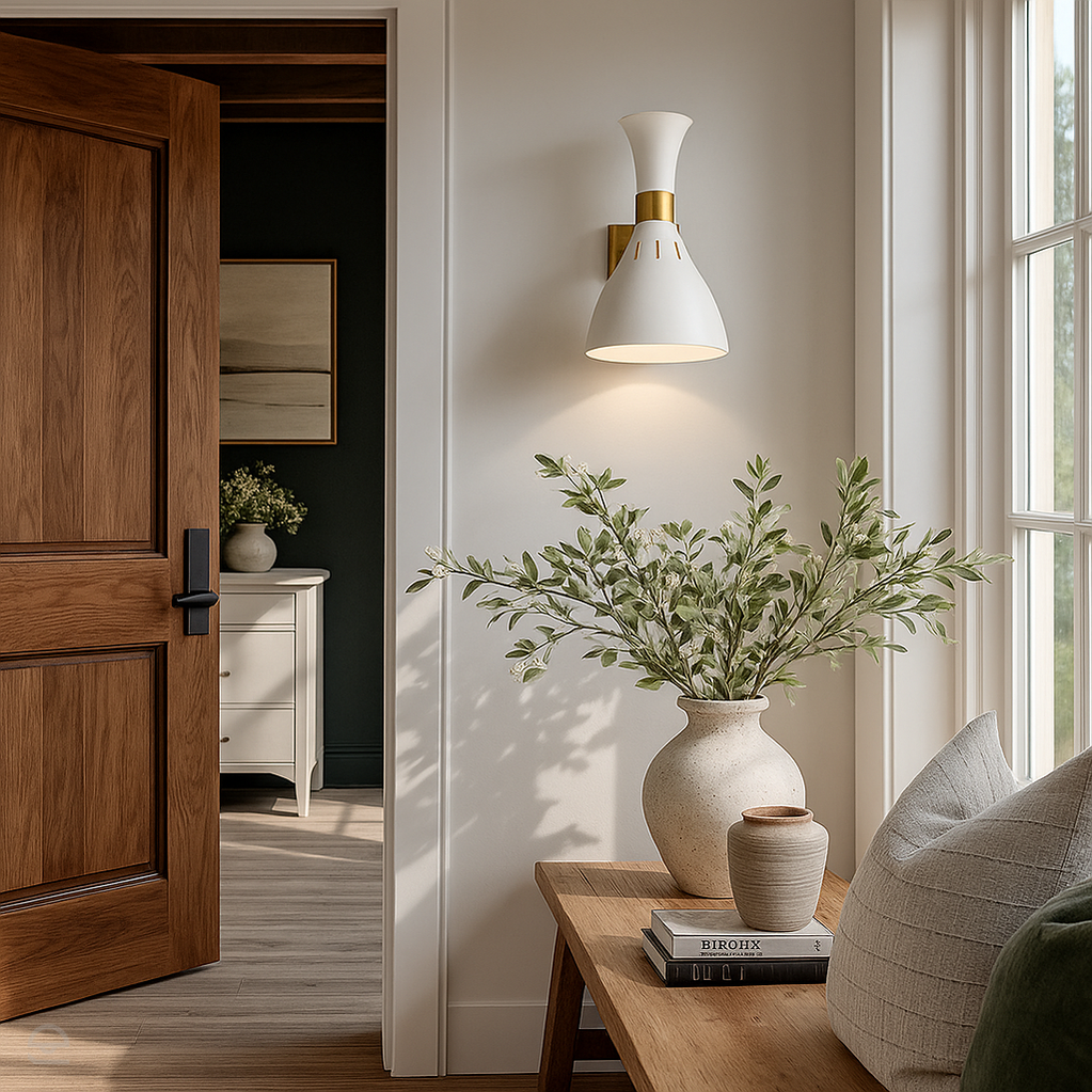Nowoczesny, bardzo dekoracyjny kinkiet, pojedynczy klosz w kształcie klepsydry w kolorze bieli, na stelażu z oksydowanego mosiądzu.